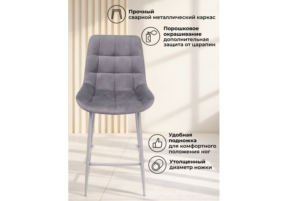 Материал каркаса - металл; Материал сиденья - велюр; Материал обивки - велюр; Цвет ножек - серый; Ширина - 50; Глубина - 58; Высота - 99; Ширина сиденья - 46; Глубина сиденья - 41; Высота сиденья - 63;