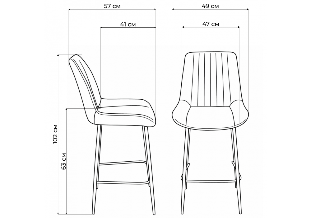 Материал каркаса - металл; Материал сиденья - велюр; Материал обивки - велюр; Ширина - 49; Глубина - 57; Высота - 102; Ширина сиденья - 47; Глубина сиденья - 41; Высота сиденья - 63;