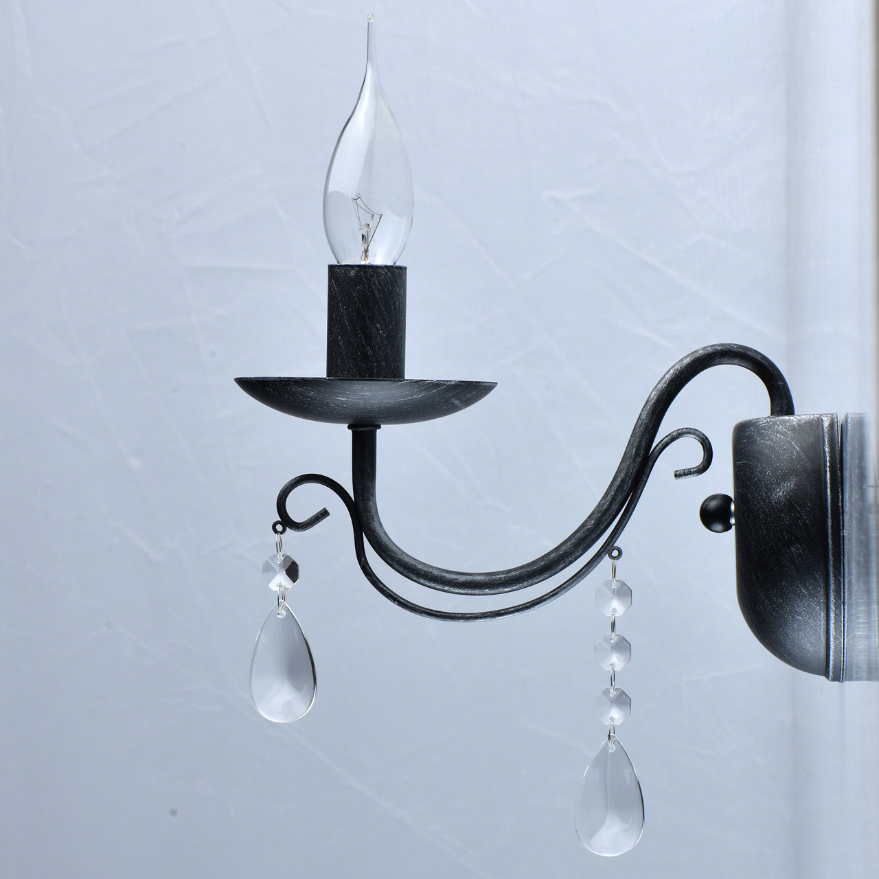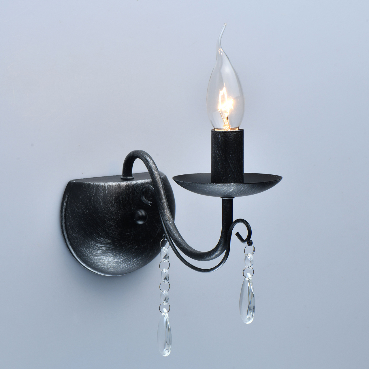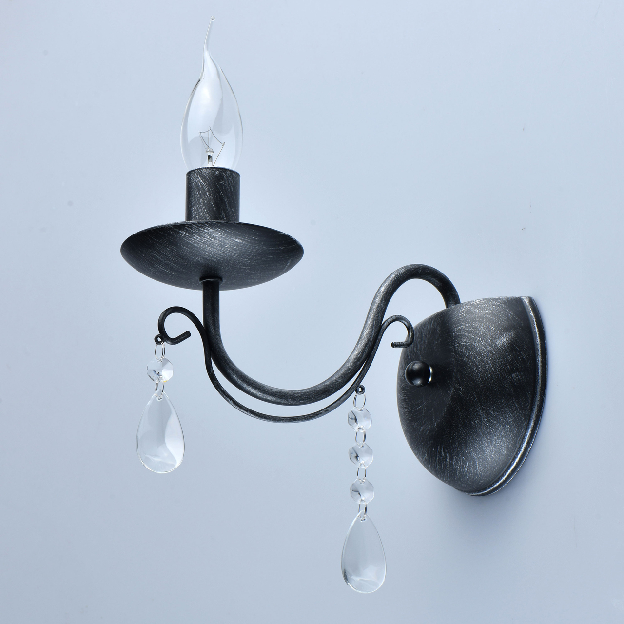 Основание светильника выполнено из металла и обработано по технологии хай-лайт, где основной слой черного цвета, а декоративный слой серебряного цвета. Светильник декорирован прозрачным хрусталем.