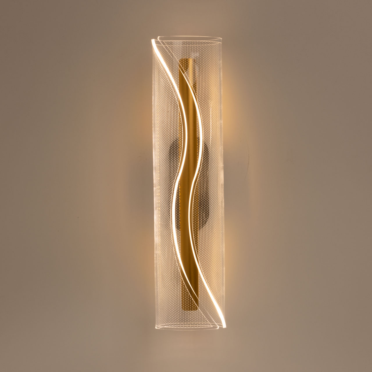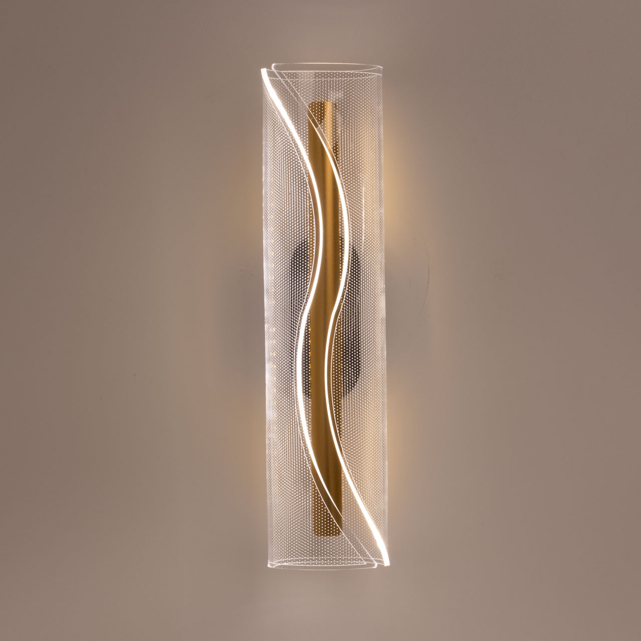 Металлический корпус настенного бра окрашен в черный цвет. Корпус плафона выполнен из сплава алюминия и окрашен в цвет золота. Настенное бра декорировано изящным элементом из прозрачного акрила с точечным рисунком.