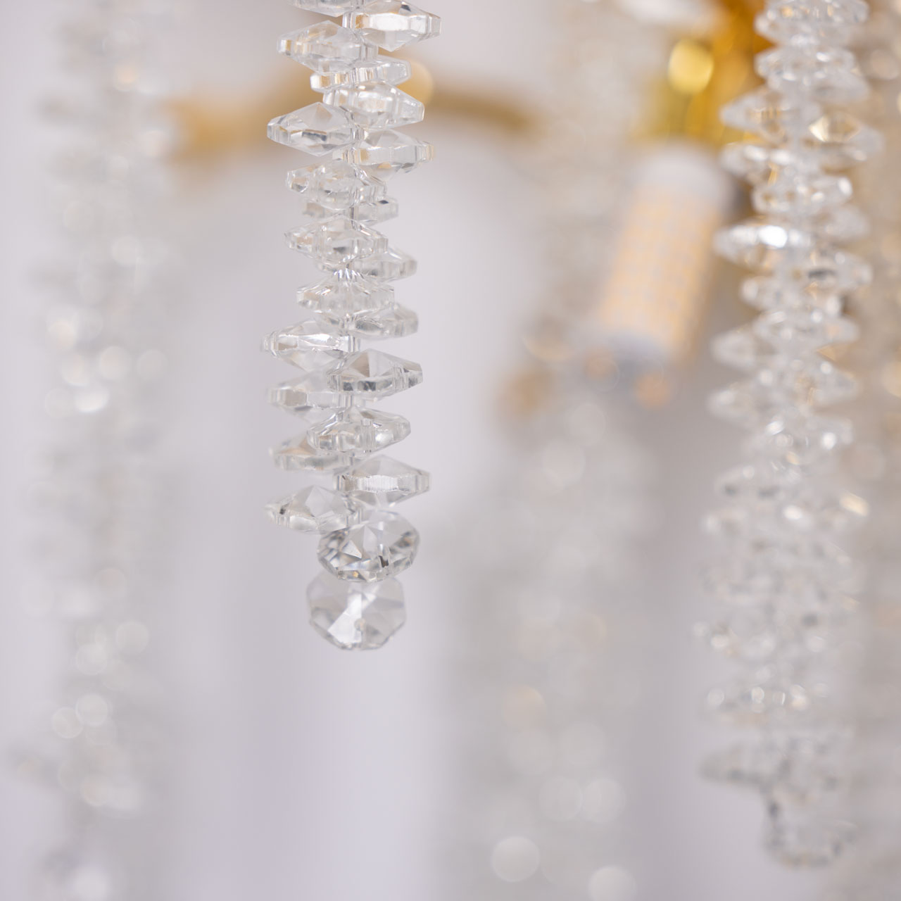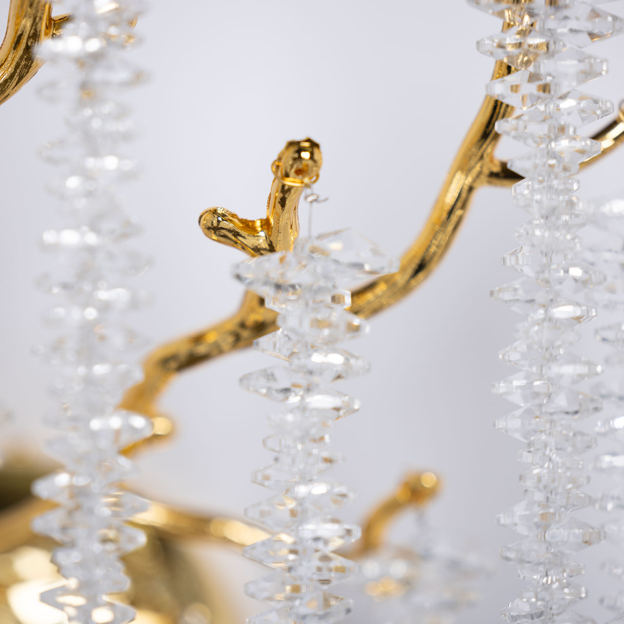 Основание подвесной люстры выполнено по технологии художественного литья из сплава алюминия с цинком и гальванизировано в цвет золота. Люстра декорирована гроздьями из прозрачного хрусталя.