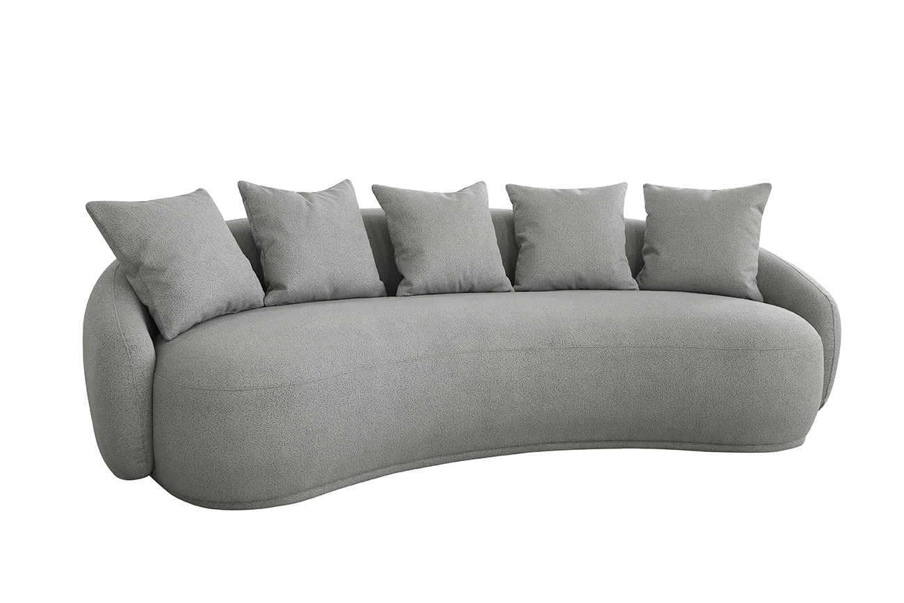 Плавные округлые линии и обтекаемые силуэты востребованы в современном дизайне. Обивка приятного серого цвета из фактурной ткани с двухцветными нитями прекрасно дополняет и делает интереснее казалось бы простую форму. Удобно расположиться для отдыха и общения помогут 5 декоративных однотонных подушек 50*50см. Габариты сиденья: ширина 212см, глубина 66см, высота от пола 42см