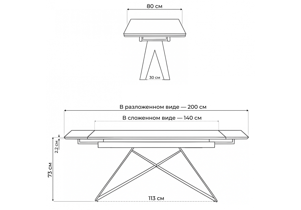 Материал каркаса - металл; Материал столешницы - Керамика; Ширина - 80; Высота - 73; Длина стола в разложенном виде - 200; Длина - 140;