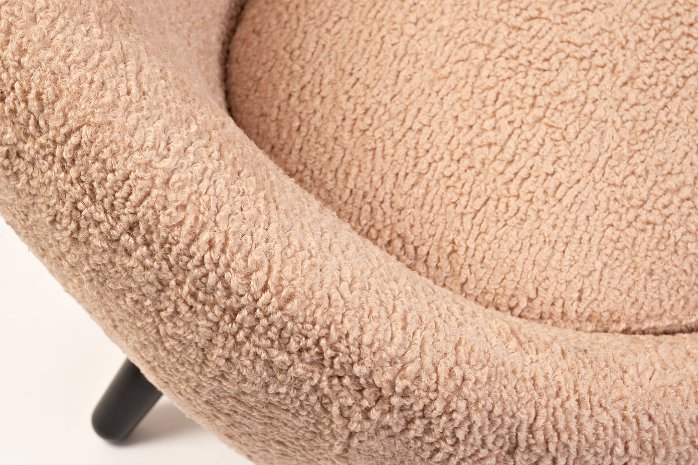 Дизайнерское кресло модной яйцеобразной формы - хит интерьерной моды. Обивка под каракуль мягкого розового оттенка, подушка на сиденье и полукруглая спинка, плавно переходящая в подлокотники, зовут и манят в свои объятия. Искусственный мех - дань защитникам окружающей среды; ведущие модные дома широко используют его не только в коллекциях одежды и аксессуаров, но и в мягкой мебели. Оригинальная форма кресла с низким сиденьем и широко расставленными деревянными ножками контрастного черного цвета выполнена в духе культовых творений скандинавских дизайнеров 60-х. Ваша комната будет выглядеть, как с обложки интерьерного журнала! Габариты сиденья: ширина - 48см, глубина - 55см, высота сиденья - 48см