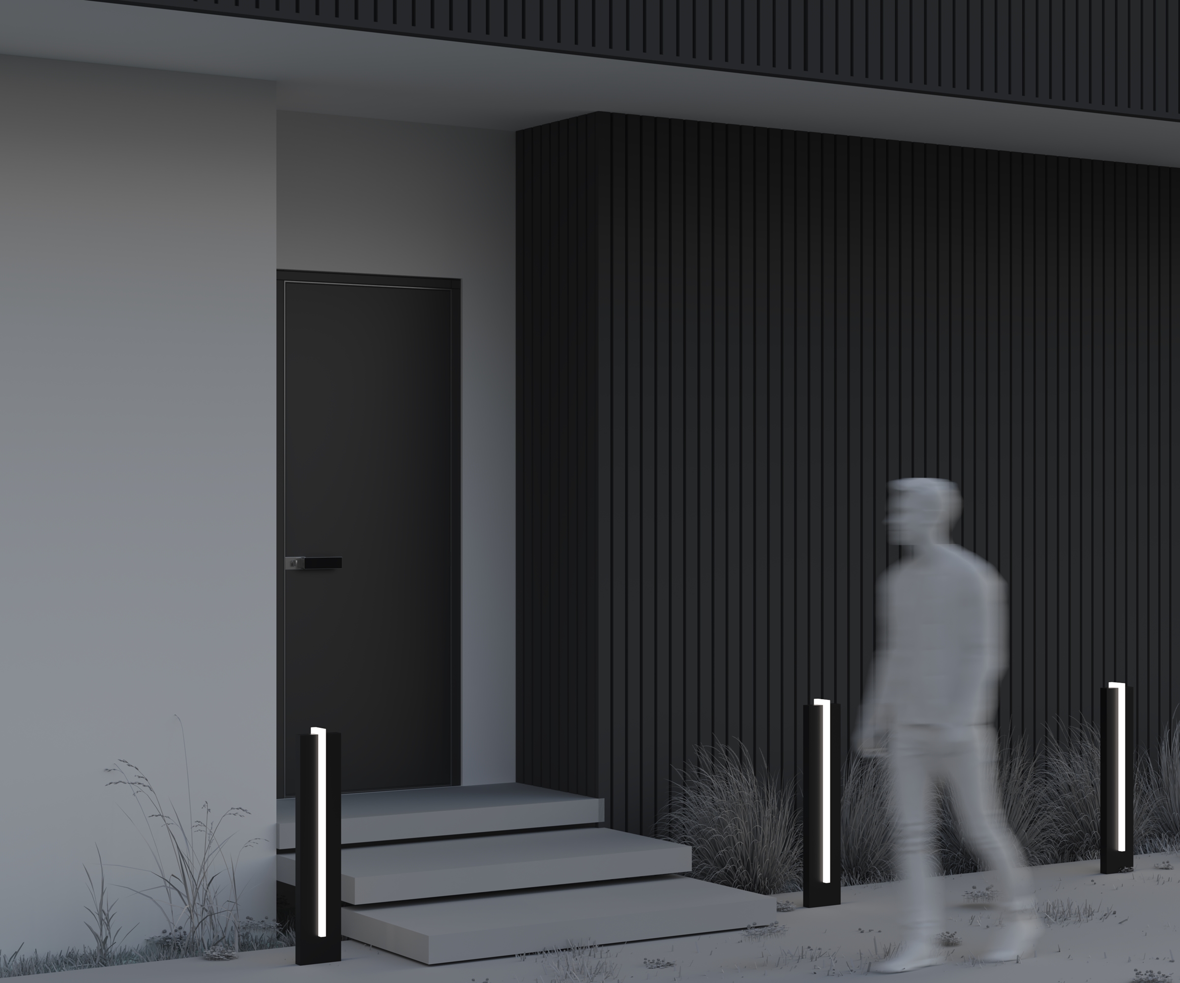 Ландшафтные светильники. Корпус — алюминий и акрил, цвет — графит. Отличительная черта — центральная светящаяся полоса. LED-технология, 10 Вт, теплый свет 3000К, CRI>80. Степень защиты — IP65. Созданы для формирования геометрически выверенных световых акцентов в садовом дизайне.