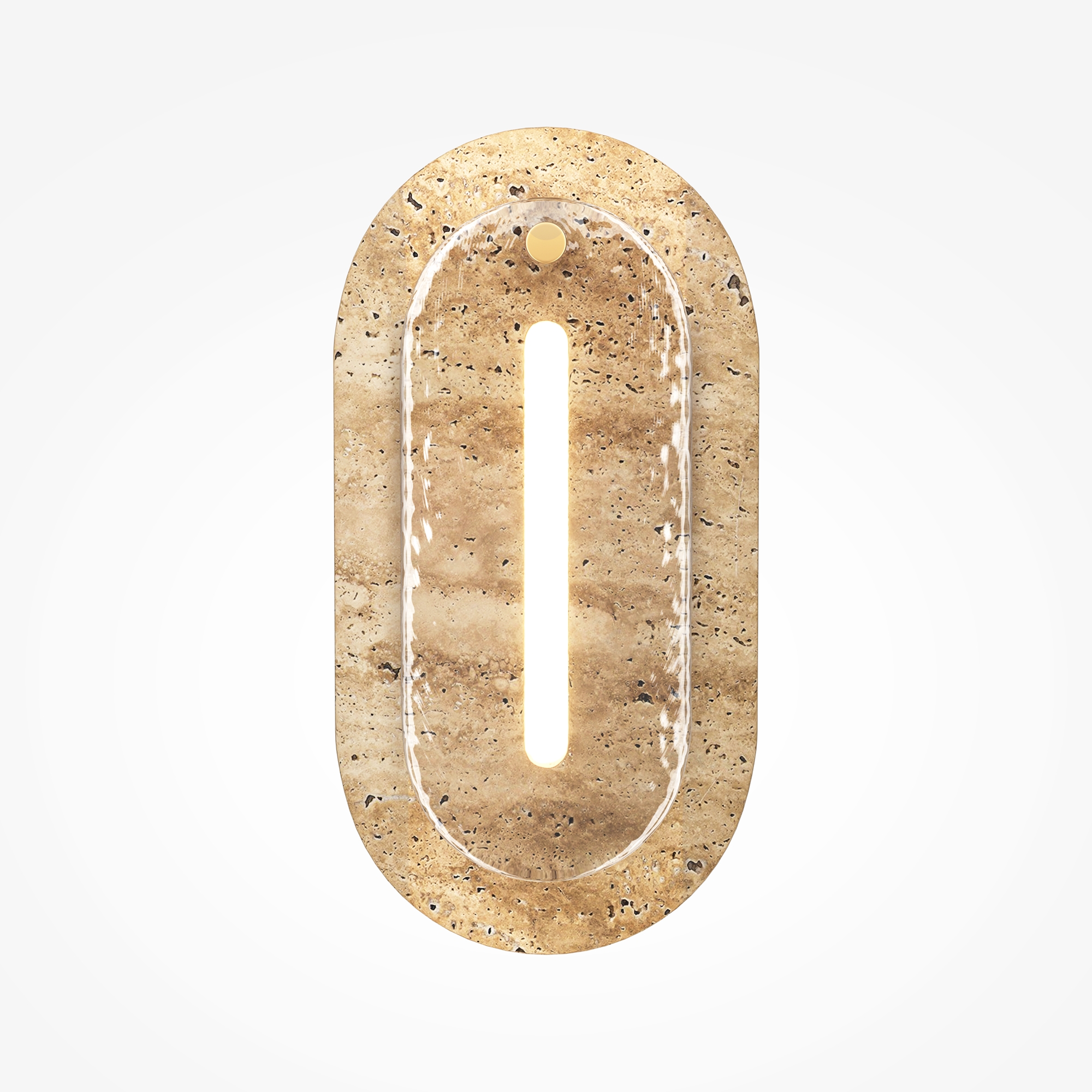 Характерный для серии контраст фактур: пористый травертин бежевого оттенка, металл цвета крашеной латуни и глянцевое стекло с «мятым» волнообразным паттерном. LED-источник (3000К) по контуру создаёт ореол на стене и подсвечивает стекло изнутри. Крафтовая обработка с неидеальными краями и лёгкой асимметрией придаёт каждому изделию эффект рукотворной эксклюзивности. Универсальны для современных жилых и коммерческих интерьеров. Эффектны как одиночный акцент и в композициях.