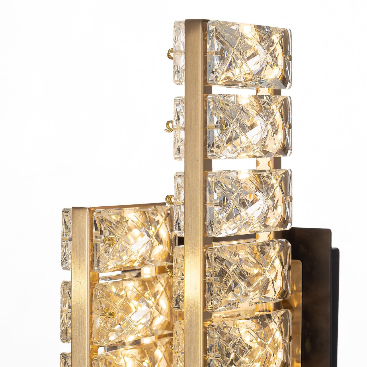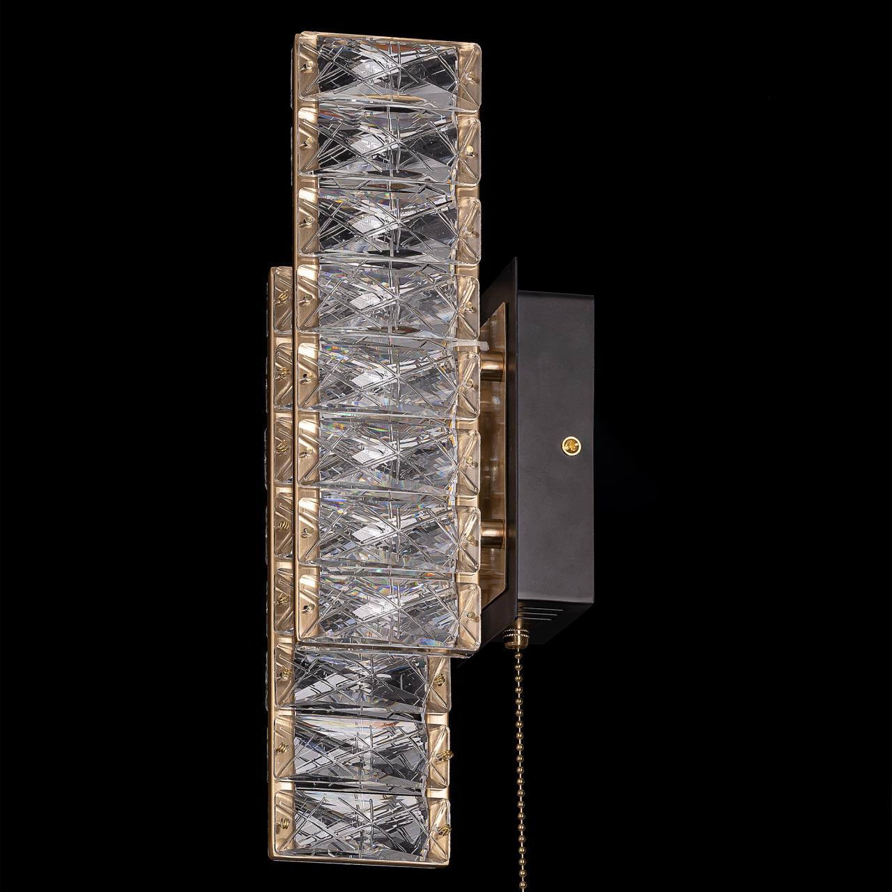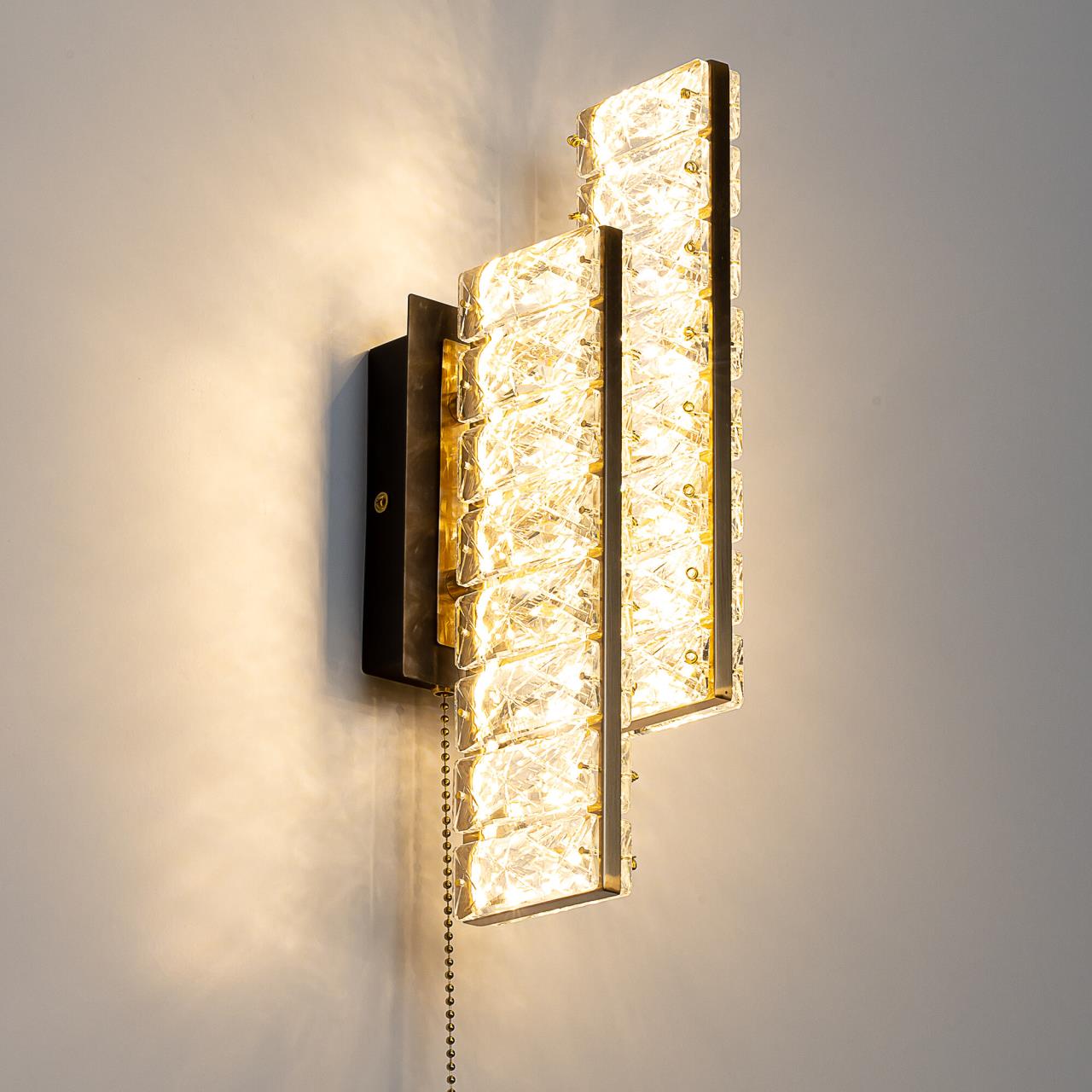 Каркас светильника — металлический, сочетаются черные и бронзовые элементы. На прямоугольном основании закреплены два вертикальных светодиодных модуля с хрустальным рассеивателем. Светодиодный свет с цветовой температурой 3000К мягко рассеивается в пространстве, играя на хрустальных гранях радужными искрами. Мощность бра — 12Вт, удобный выключатель-шнурок расположен на корпусе.