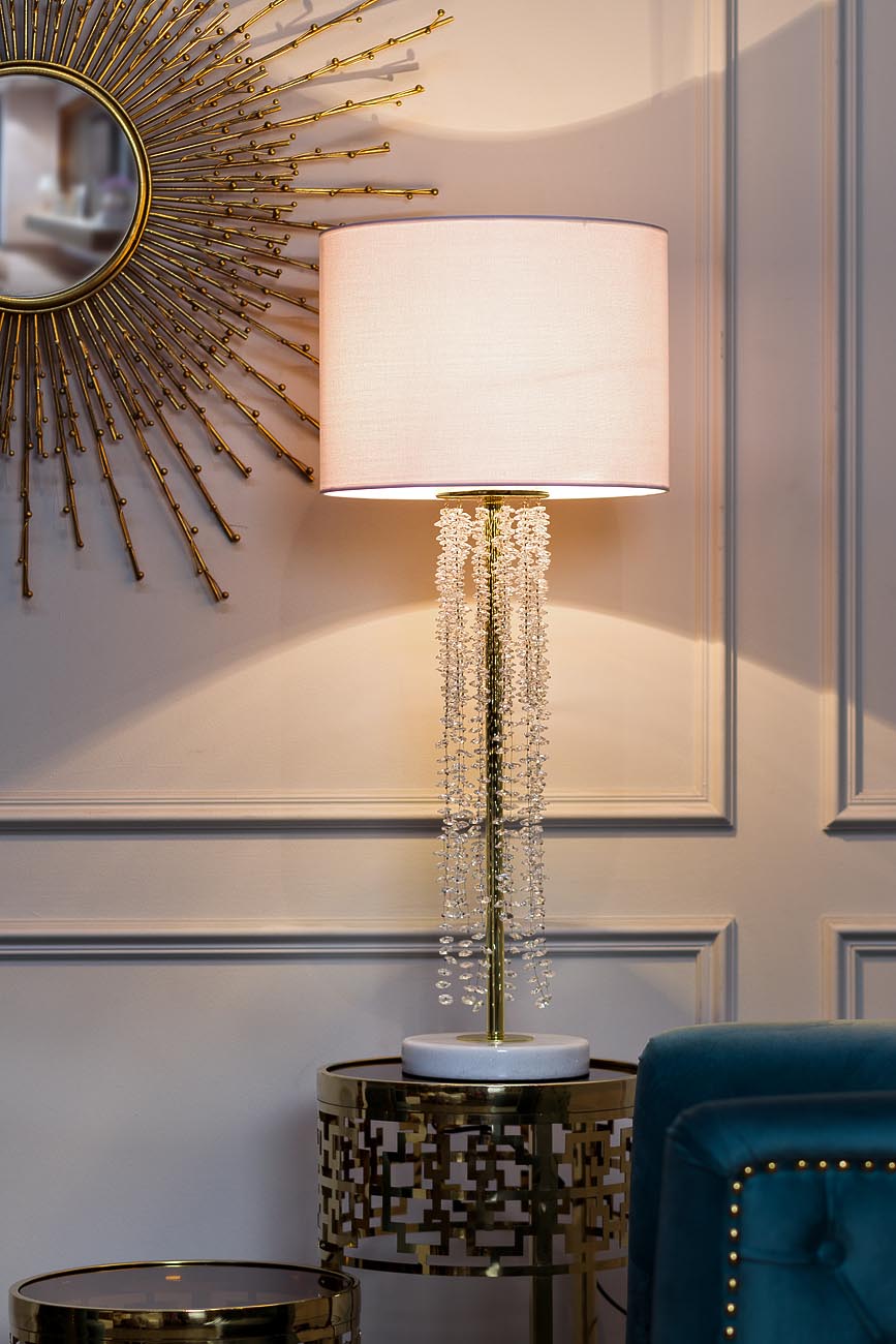 Создателей дизайнерской настольной лампы вдохновляли загадочные и прекрасные морские обитатели - медузы. Длинные ассиметричные подвески-"щупальца", созданные из сотен прозрачных кристаллов, спускаются каскадом из центра изящного абажура молочно-белого цвета. Золотистое основание закреплено на устойчивой подставке из белого мрамора. Мягкие волны света, падающие от лампы, превращают пространство комнаты в таинственные морские глубины, навевают сны о дальних странствиях и далеких берегах. Лампа станет настоящим подарком романтикам и мечтателям, прекрасно впишется в спальную комнату или изысканную гостиную.