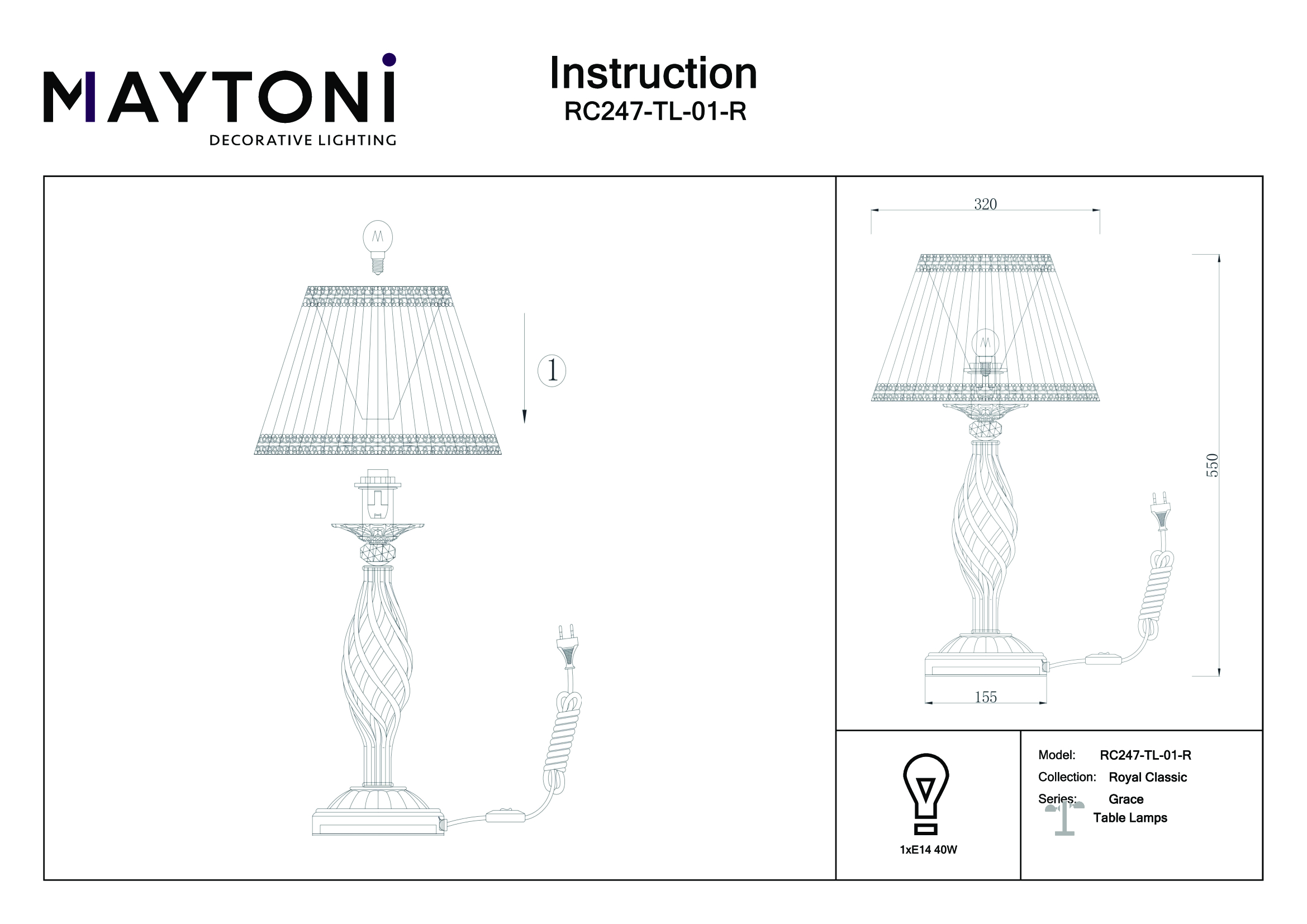 Настольная лампа Grace RC247-TL-01-R от производителя Maytoni представляет собой элегантное и стильное решение для вашего интерьера. Этот изысканный предмет декора добавит нотку роскоши и изысканности в любую комнату. Лампа имеет компактные размеры 320 мм х 550 мм, что позволяет установить ее на любом удобном месте. Диаметр плафона составляет 320 мм (32 см), а высота лампы - 550 мм (55 см). Это идеальные пропорции, которые не займут много места, но обеспечат достаточное освещение для вашего рабочего стола или столовой. Технические характеристики лампы также впечатляют. Осветительный прибор оснащен одной лампой с типом цоколя Е14 и мощностью 60 Вт, что гарантирует легкую замену и установку осветительных элементов и позволяет равномерно осветить площадь в 3,3 квадратных метра Лампа выполнена в коричнево-бежевых тонах, что придает ей шикарный и изысканный вид. Бежевый цвет плафонов из органзы и бронзовый цвет арматуры из металла гармонично сочетаются между собой, создавая элегантный контраст. Основание настольного светильника декорировано ажурными переплетениями из металла. Витиеватые сплетения являются характерной чертой серии, а многочисленные подвески из кристаллов украшают конструкцию. Настольная лампа Grace RC247-TL-01-R от Maytoni — это прекрасное сочетание стиля, функциональности и качества. Позвольте этому идеальному аксессуару добавить неповторимость и уют в ваш дом или офис.
