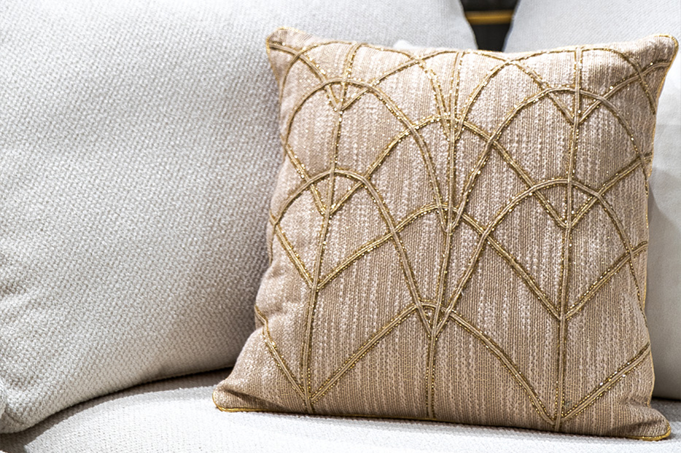 Люди с утонченным вкусом нередко отдают предпочтение стилю арт-деко. Эта декоративная подушка 45х45 см – один из простых способов придать своему интерьеру богемности популярного стиля. Благородный бежевый цвет, замысловатое переплетение вышитой ленты, блестящий бисер – все это сформировало шедевр в виде бежевой декоративной подушки. Она подойдет к диванам и текстилю любых оттенков. Подобрать единое текстильное сопровождение для декорирования вашего дома можно на нашем сайте.