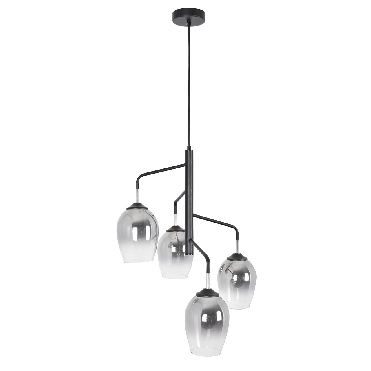 Металлическое основание подвесной люстры окрашено в черный цвет. Отдельные элементы основания гальванизированы в цвет хрома. Стеклянные плафоны выдуваются в форму и гальванизированы в дымчатый цвет по принципу градиента - от основания плафона к краю цвет истончается.