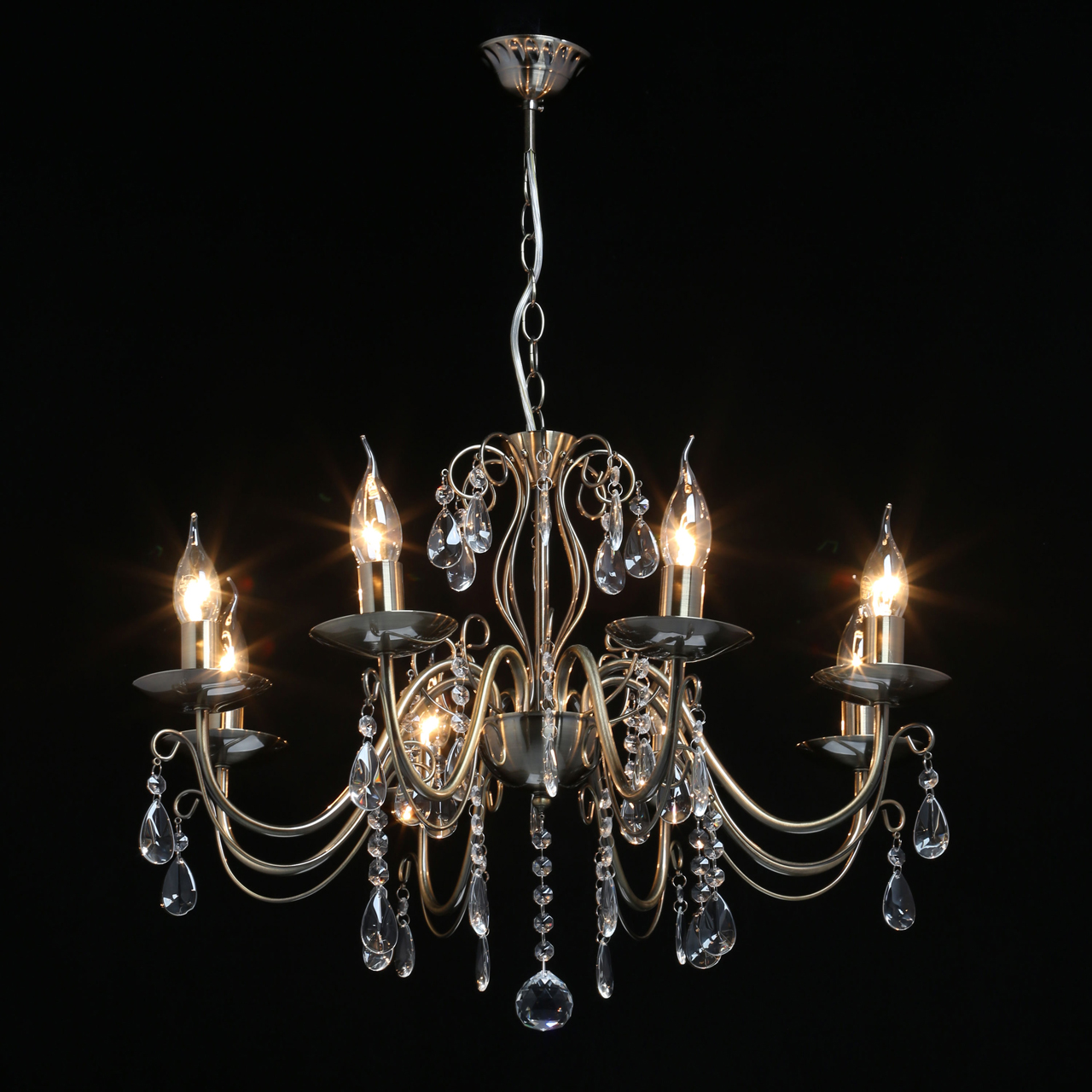 Отсутствие закрытых плафонов обеспечивает высокий уровень освещенности: потолочная лампа может быть использована в комнате площадью до 24 кв. м. Несмотря на внушительные размеры, она весит всего 2.8 кг. Оригинальный дизайн дополнят восемь ламп с цоколем E14 в форме «свеча» или «свеча на ветру», устанавливаемых по всему периметру светильника. Его высота регулируется за счет звеньев цепи.