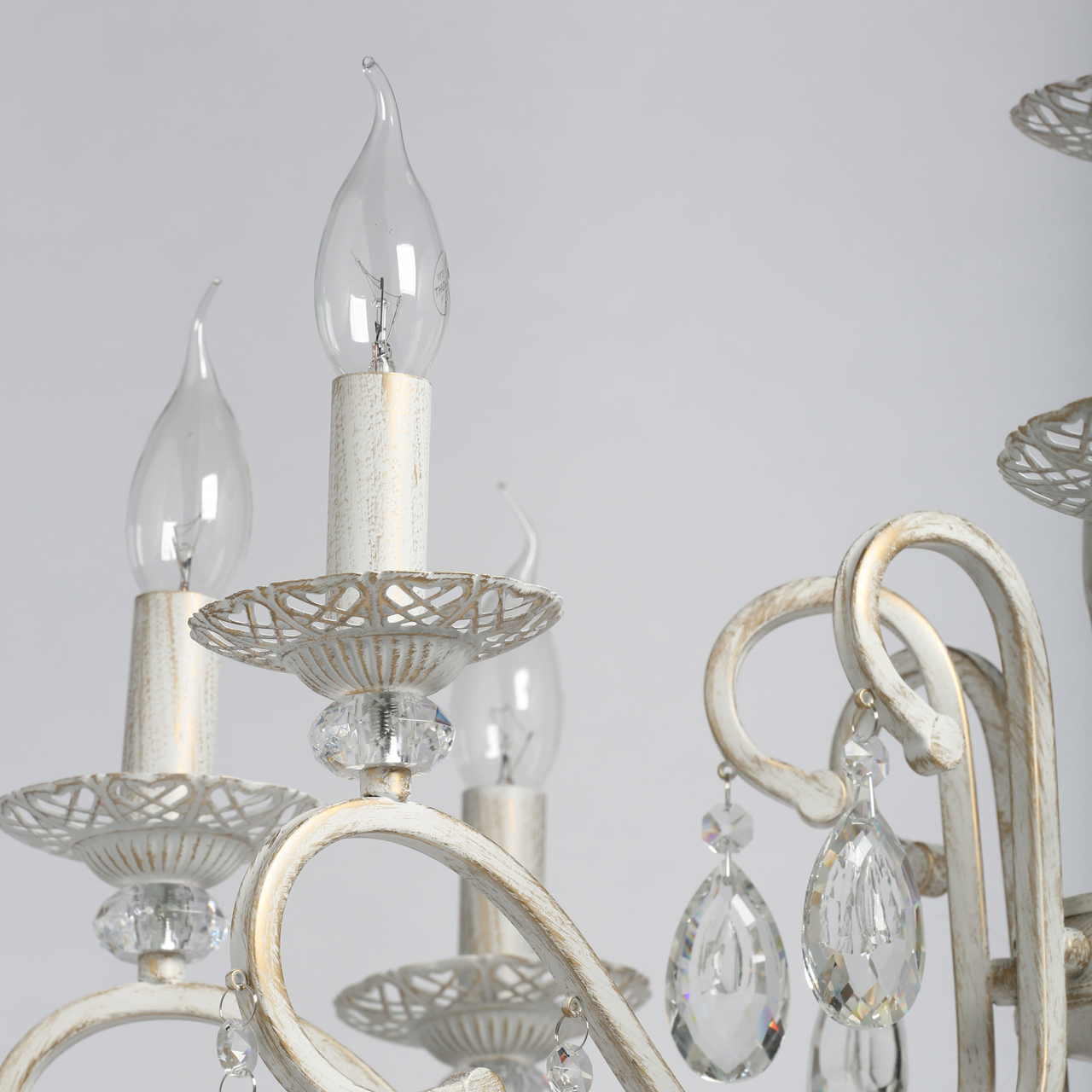 Классическая форма рожков-свечей с наборным основанием белого цвета с золотистой патинойШирокий диаметр у модели на 8 рожков .Оригинальная огранка хрустальных подвесок.Декор рожков с резными розетками придает легкости конструкции.Возможность регулировать высоту светильника, убирая лишние звенья цепи.