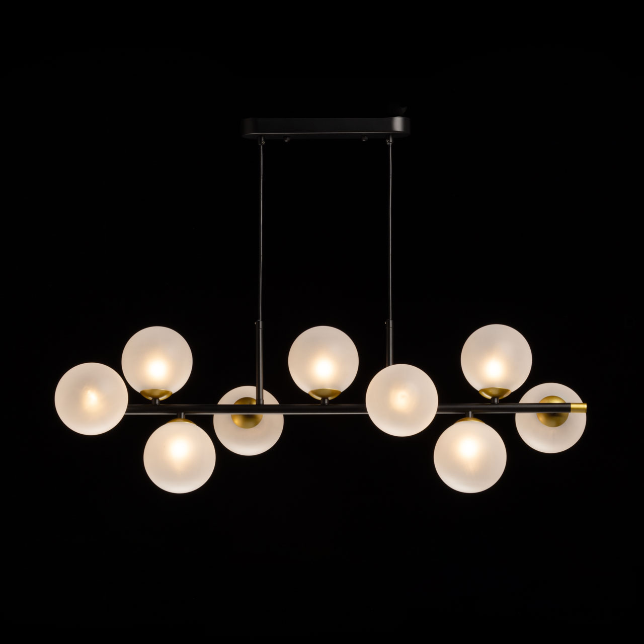 Металлическое основание окрашено в черный цвет. Отдельные элементы основания окрашены в цвет золота. Заменяемые источники света с цоколем G9 закрыты матовыми стеклянными плафонами.