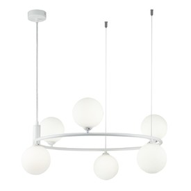 Подвесная люстра Maytoni Ring MOD013PL-04W, входящая в коллекцию Modern, отлично подойдет для освещения пространства в гостиной, на кухне, на даче, в кабинете, в баре, кафе и ресторане, оформленных в современном, в скандинавском стиле или в стиле Хай-тек. Данный артикул имеет четыре плафона белого цвета в форме шара, выполненных из стекла и направленных вниз и вверх, а также матовую белую арматуру, изготовленную из металла. Немецкий производитель Maytoni дает гарантию на свое изделие 2 года и рекомендует использовать для устройства энергосберегающие лампы с цоколем G9 по 25 Вт каждая лампа и общей мощностью 100 Вт, что позволяет осветить помещение площадью 5,6 кв. м. Технической особенностью этого осветительного прибора является возможность регулирования по высоте, при этом максимальная высота люстры составляет 184 см. Способ крепления светильника к потолку на планку позволяет быстро и просто осуществить монтаж, при этом подходит для всех типов потолков, в том числе и натяжных. Стильный дизайн, тип подвеса на тросиках и матовая поверхность подвесной люстры Maytoni Ring MOD013PL-04W делают ее особенным элементом декора, который украсит любое интерьерное пространство.