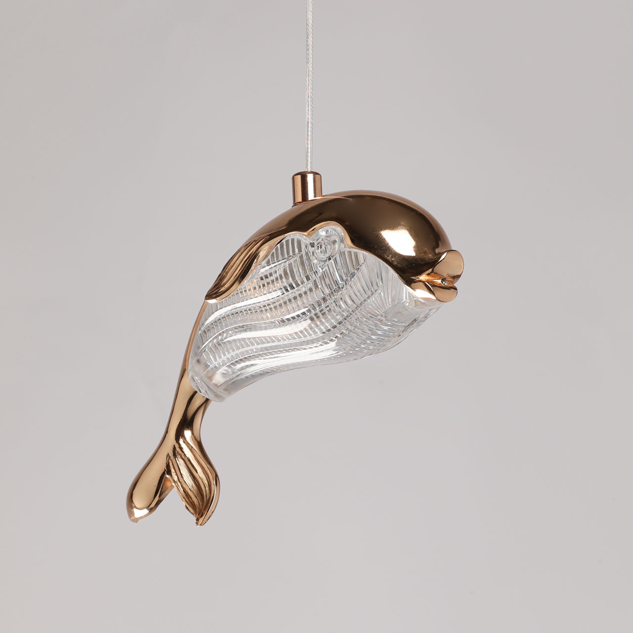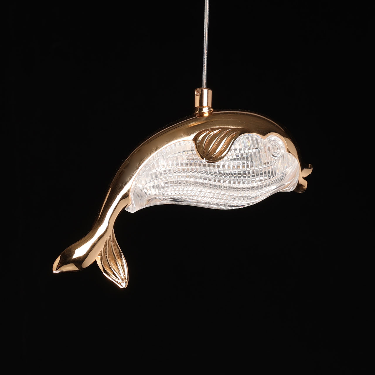 Металлическая потолочная чаша подвеса гальванизирована в цвет французского золота. Корпус плафона в виде дельфина выполнен из сплава алюминия с цинком по технологии художественного литья и гальванизирован в цвет основания. Светодиодный источник света закрыт прозрачным фактурным акрилом.