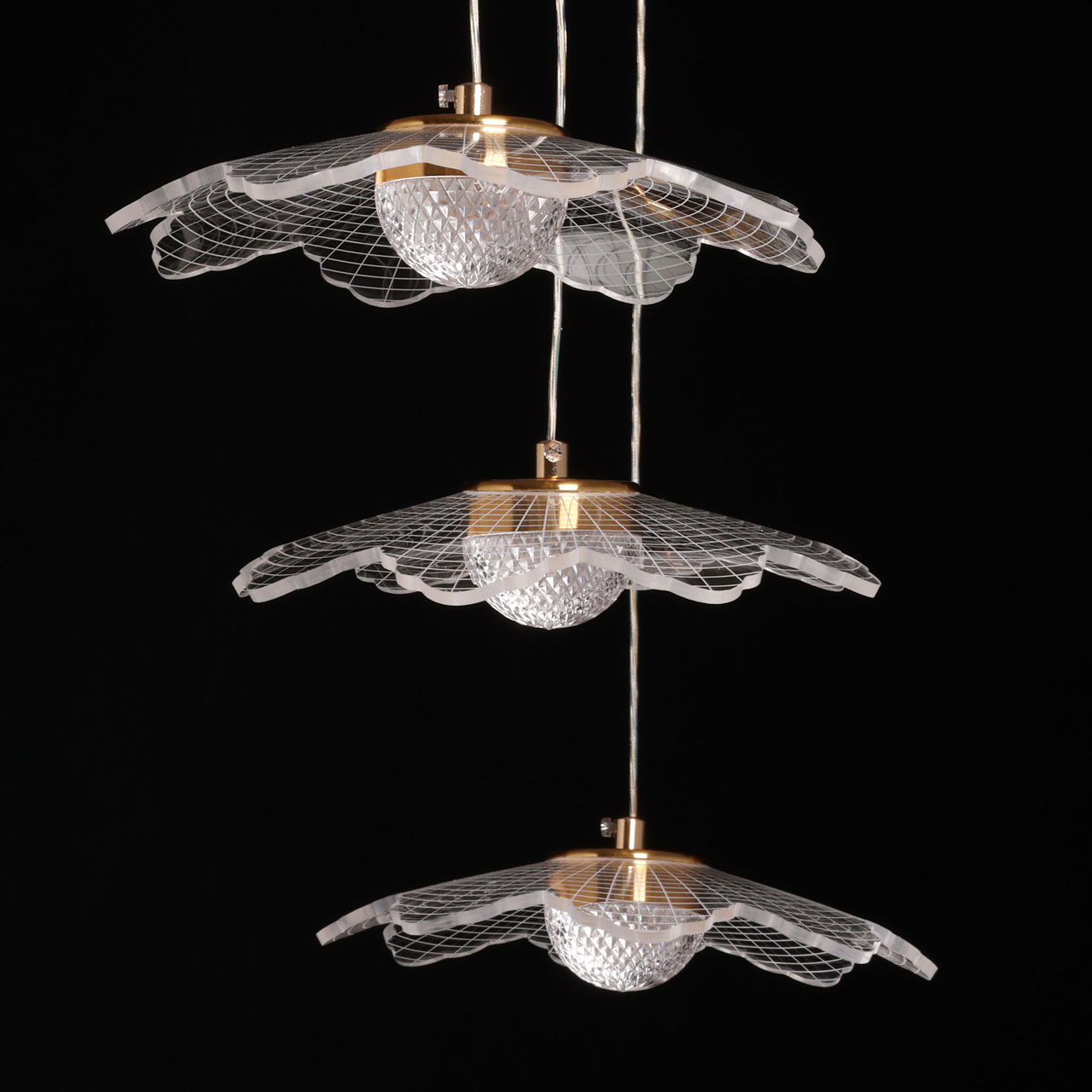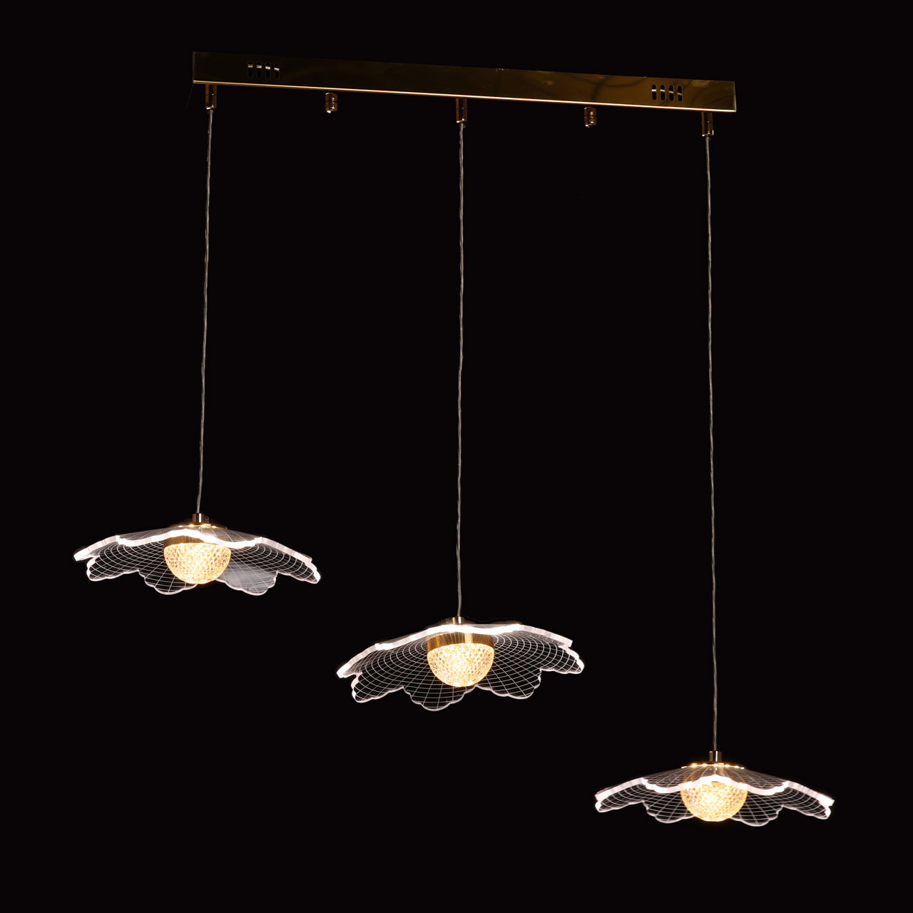 Металлическое основание светильника гальванизировано в цвет золота. Корпус плафона выполнен из сплава алюминия с цинком. Плафоны выполнены из прозрачного акрила.