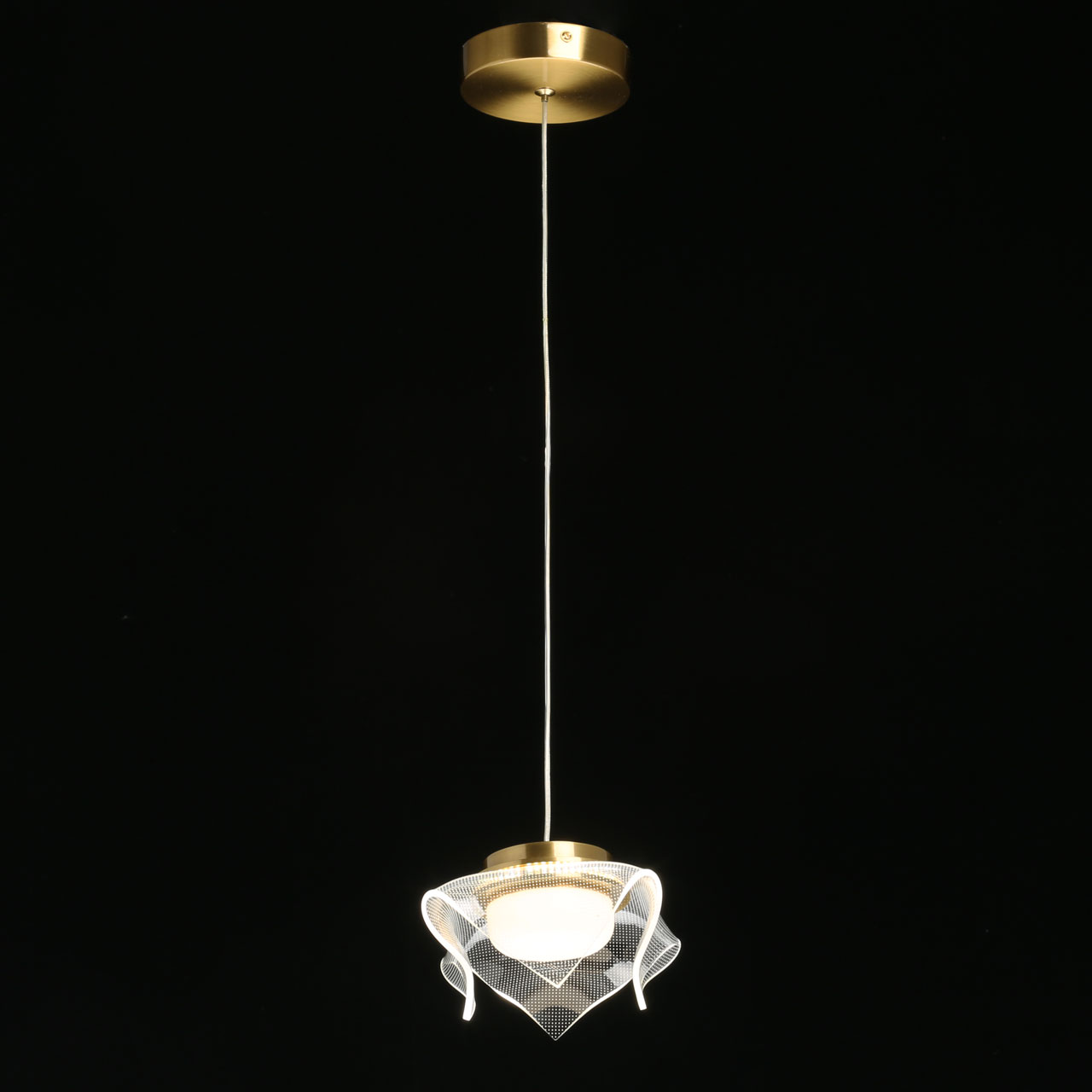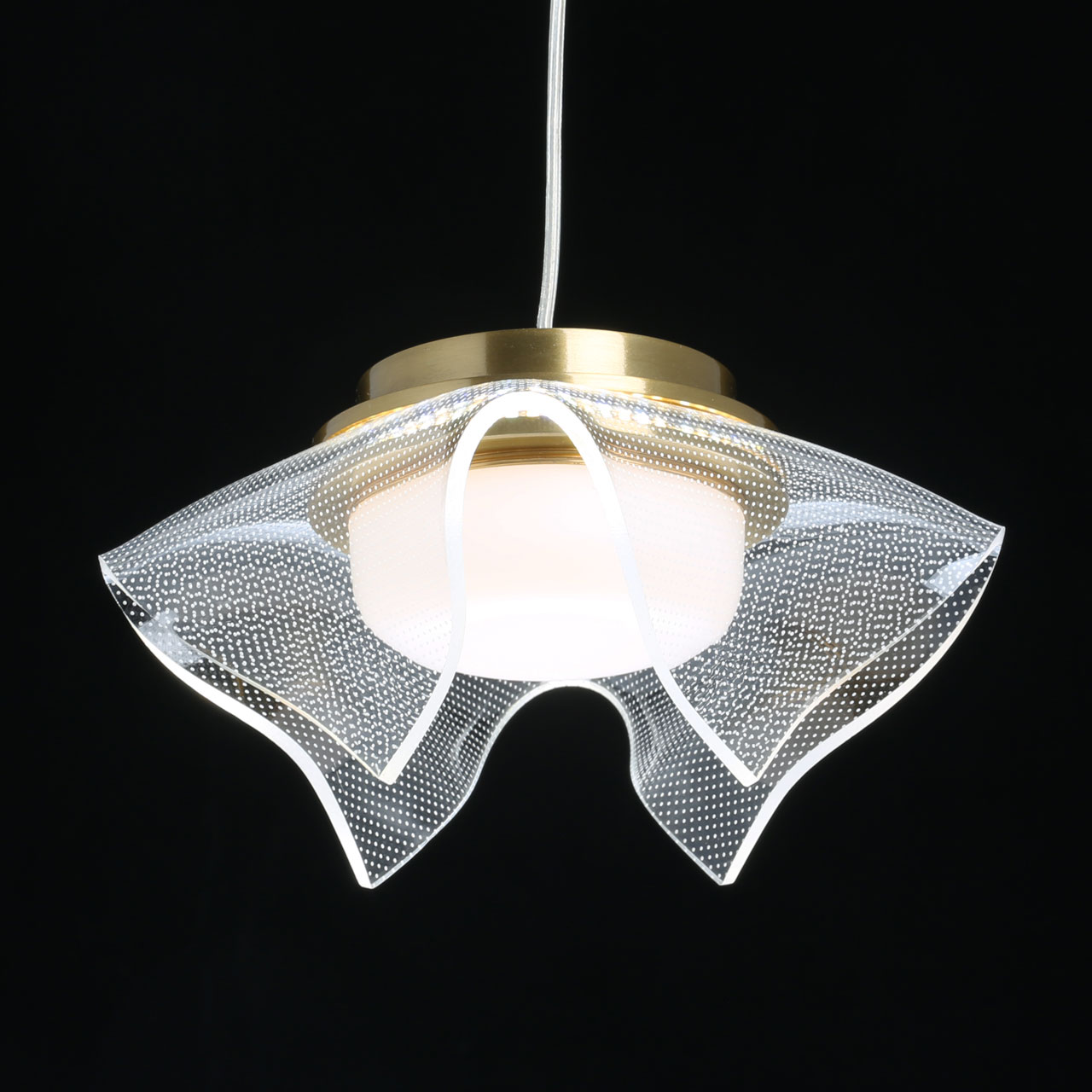 Металлическое основание одиночного подвеса гальванизировано в цвет бронзы. Плафон выполнен из прозрачного акрила с точечным рисунком. Светодиодный источник света закрыт белым матовым акрилом.