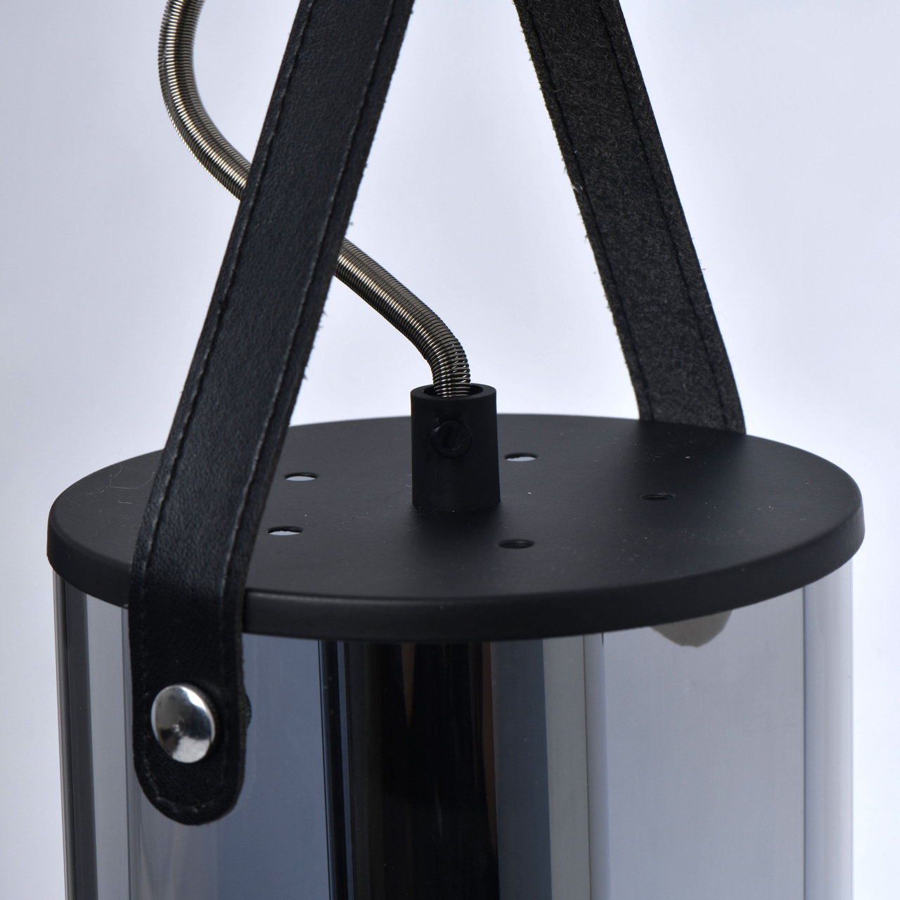 На парящей планке расположены 4 подвеса из стекла цвета антрацита. Основание из металла окрашено в черный цвет. К нему крепятся черные кожаные ремешки, которые и удерживают на весу источники освещения. Свет получается мягким, приглушенным, создает умиротворяющую, романтичную атмосферу. Модель идеально подходит для создания акцентов на конкретных зонах: подсветки обеденного стола, барной стойки, зоны отдыха.