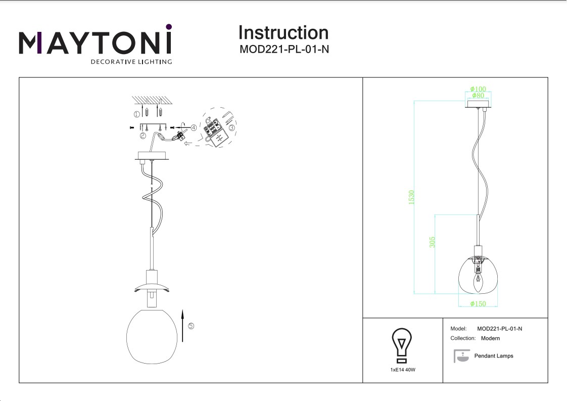 - Диаметр плафона (абажура): 150