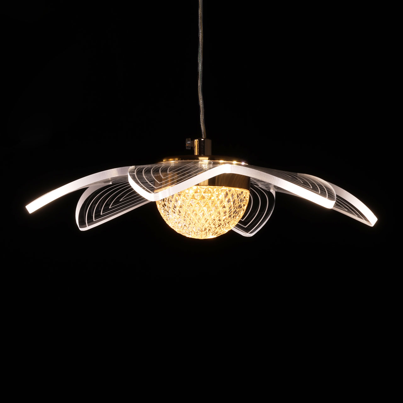 Цвет золота прекрасно сочетается с современными формами и материалами. Светодиодные источники света закрыты прозрачным многогранным акрилом, создающим эффект красивой игры бликов света. Эстетическую привлекательность придают светильнику внешние плафоны в виде цветов. Многорежимность освещения от 3000К до 6500К позволяет подобрать комфортную температуру света. Качественные светодиоды экономичны и долговечны.