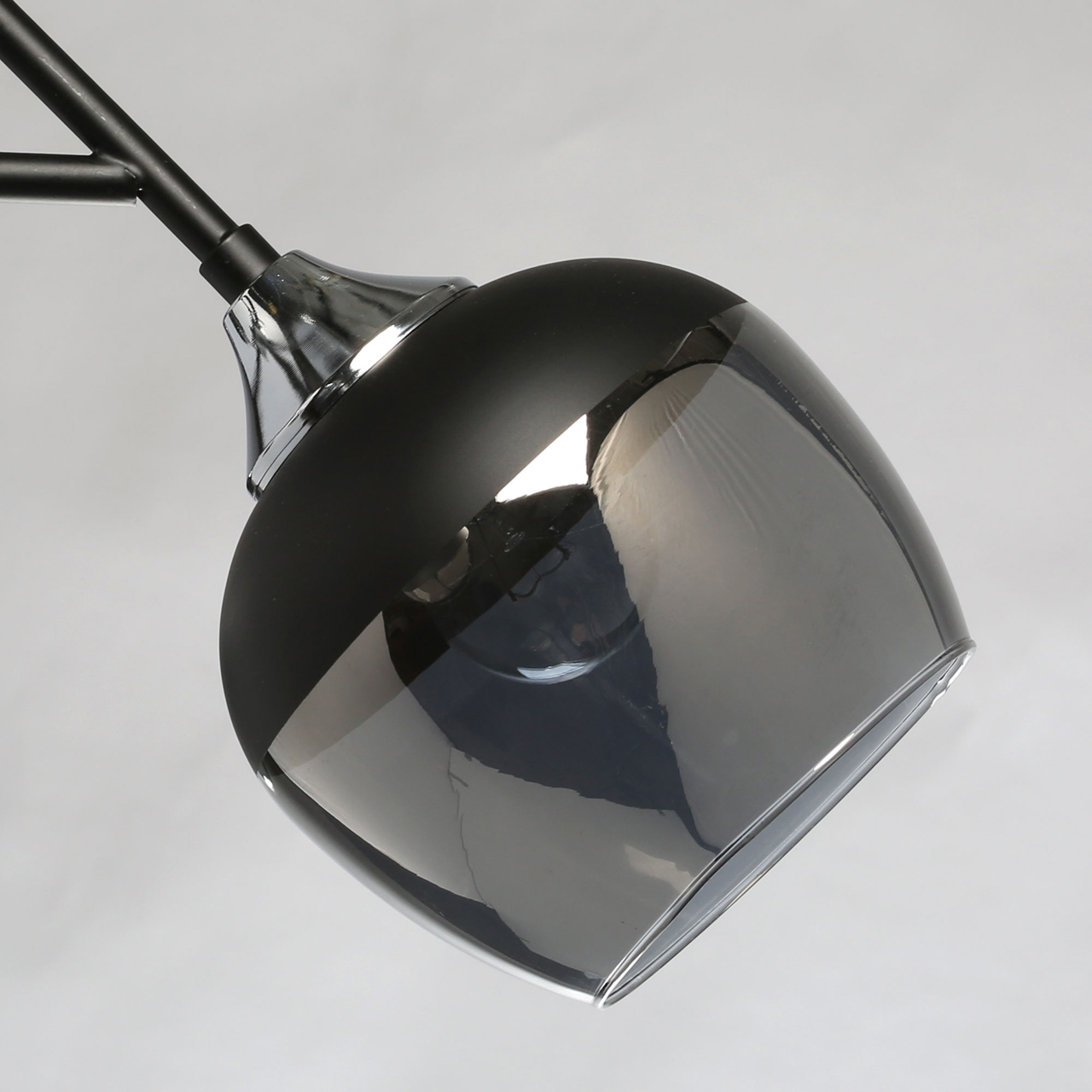 Основание светильника выполнено из металла и окрашено в черный цвет. Отдельные элементы основания гальванизированы в цвет хрома. Стеклянные плафоны гальванизированы в дымчатый цвет и окрашены в черный цвет у основания.