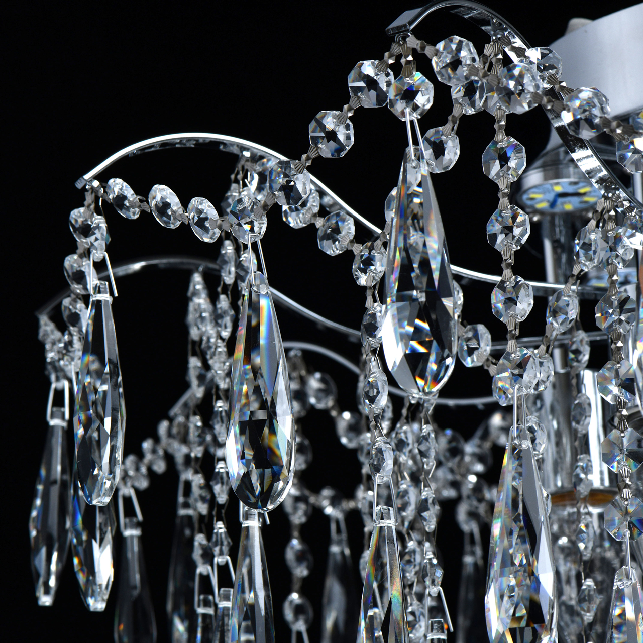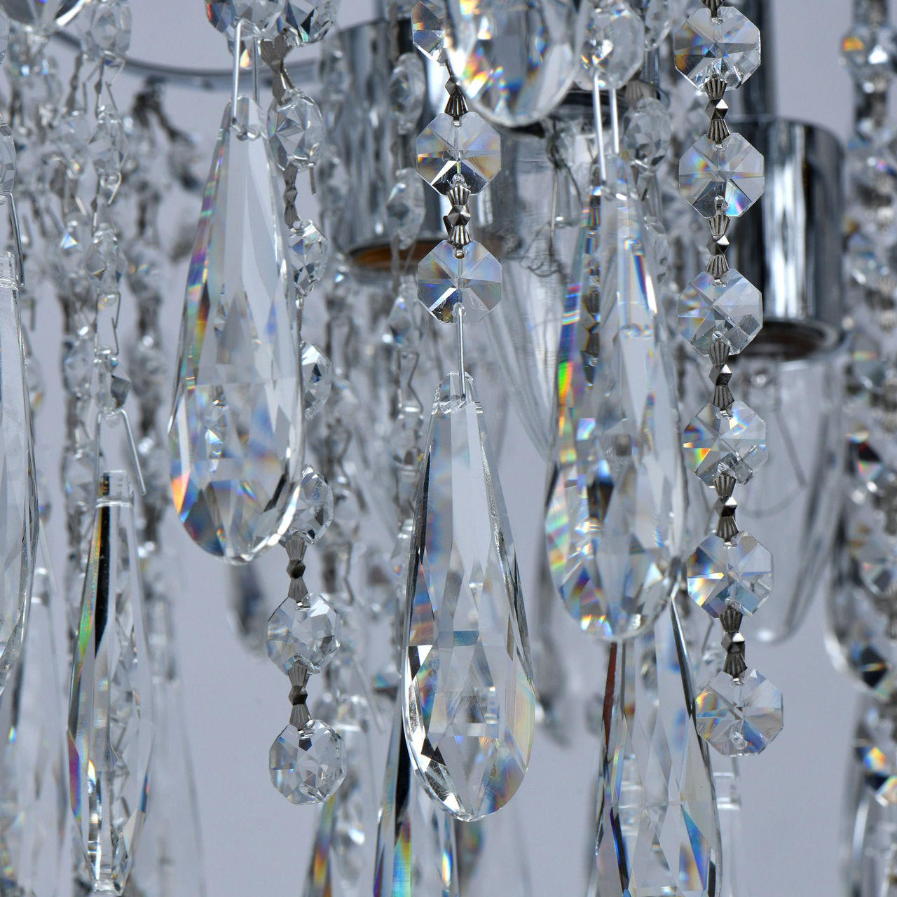 Основание светильника выполнено из металла и гальванизировано в цвет хрома. Светильник декорирован прозрачным хрусталем формы октагон и капля.