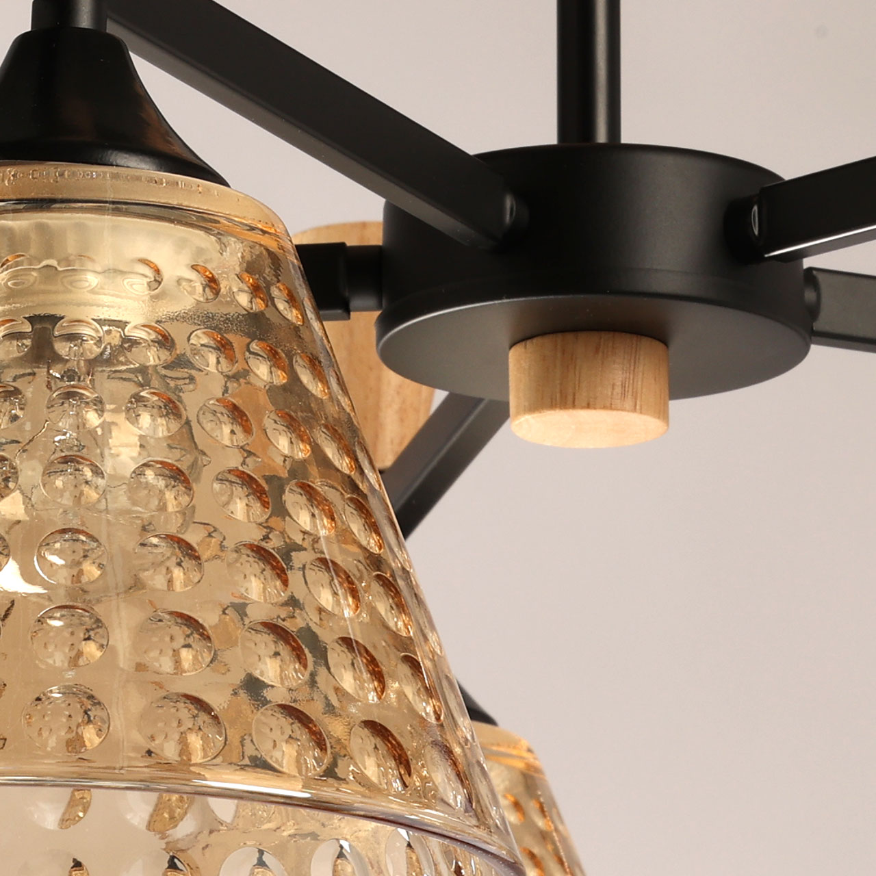 Металлическое основание потолочной люстры окрашено в черный цвет. Стеклянные плафоны отлиты в сложную форму и гальванизированы в цвет шампань. Светильник декорирован элементами из натурального светлого дерева.