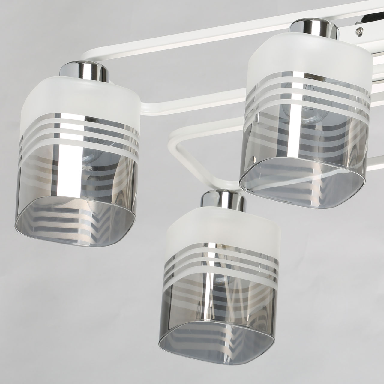 Металлическое основание потолочного светильника окрашено в белый цвет. Отдельные элементы гальванизированы в цвет хрома. Стеклянные плафоны гальванизированы в дымчатый цвет и окрашены в белый цвет в виде параллельных полос
