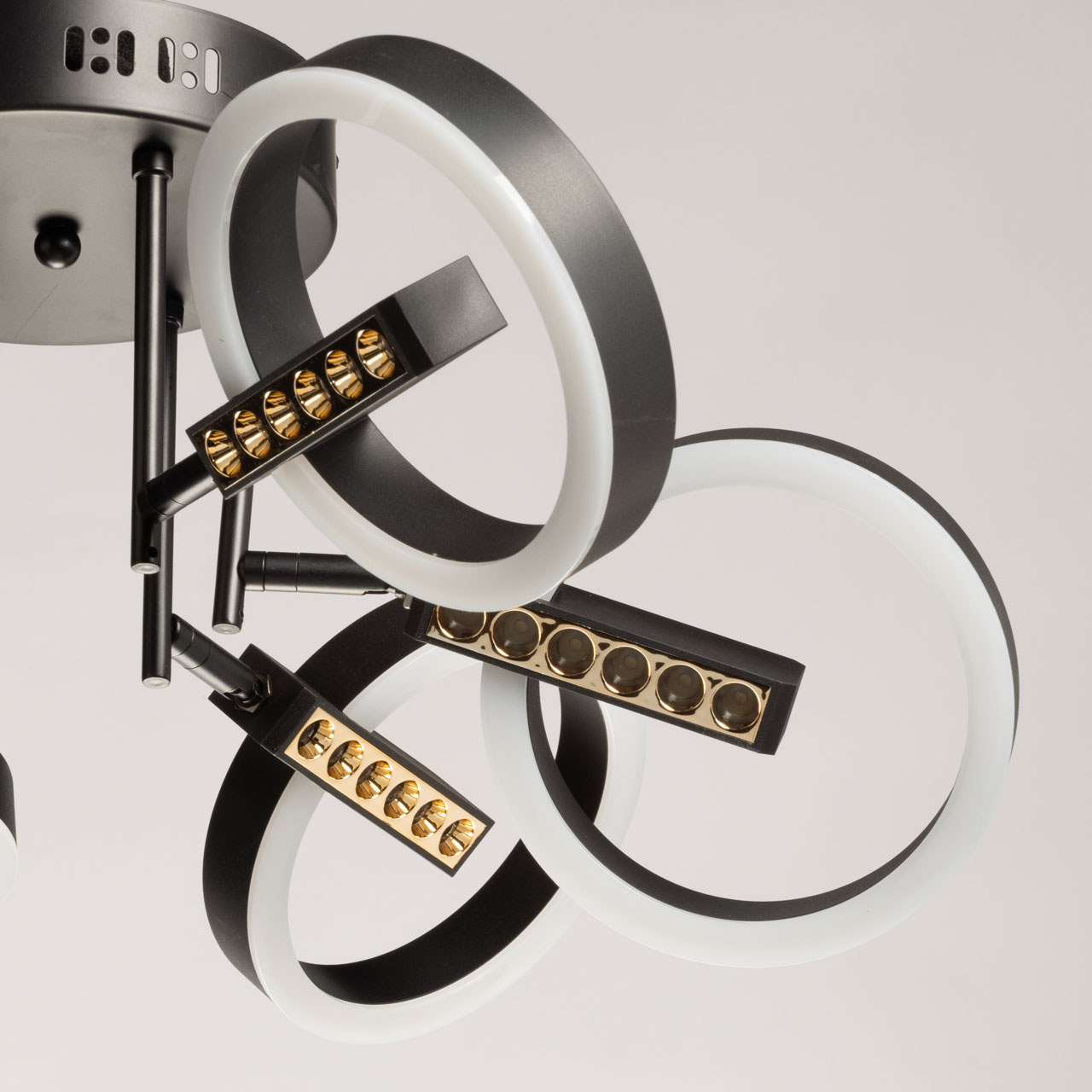 Металлическое основание подвесной люстры окрашено в черный цвет. Корпус плафонов выполнен из сплава алюминия и окрашен в цвет основания. Светодиодные источники декоративного света закрыты матовым акрилом. Открытые функциональные точечные светодиоды углублены в корпус плафонов.