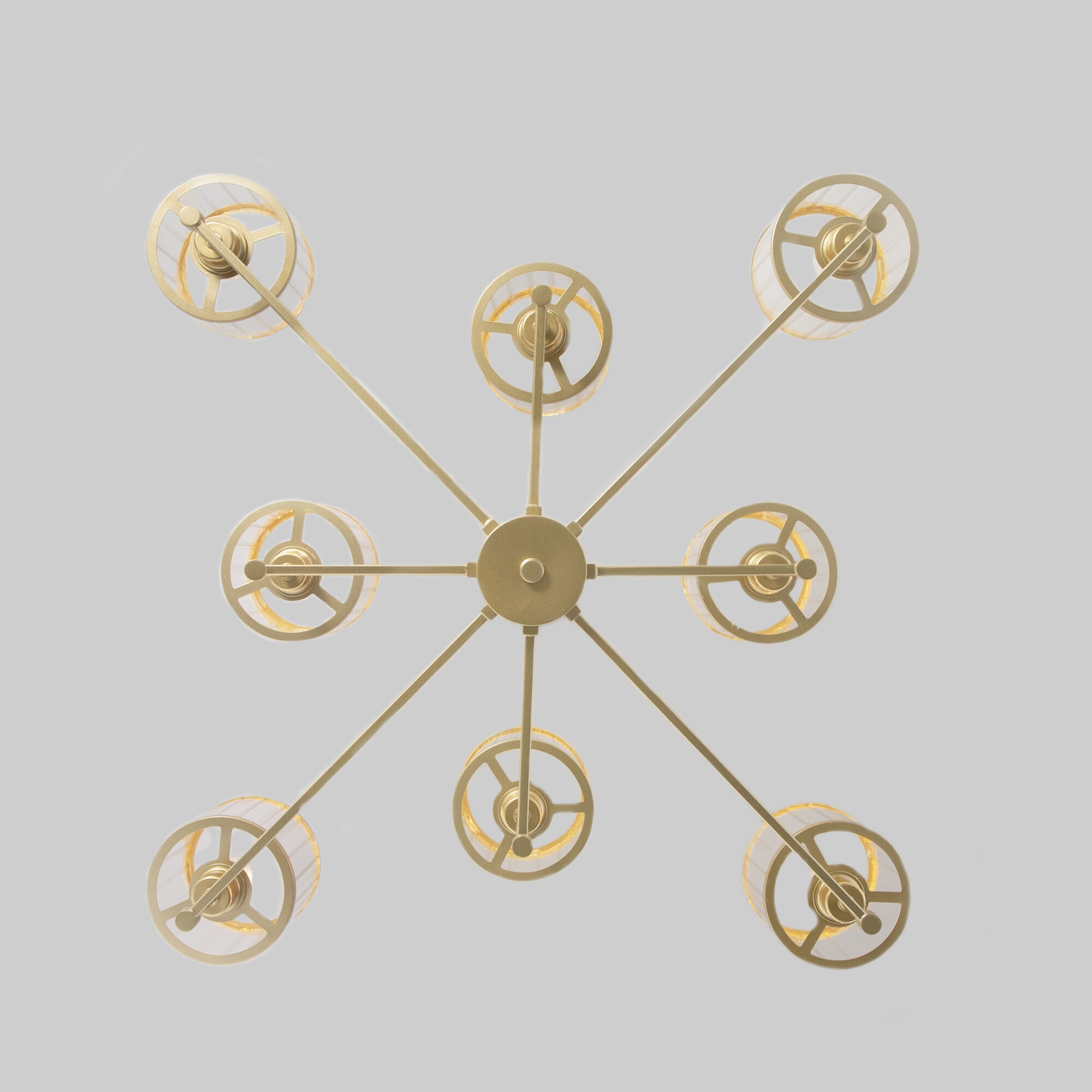 Люстра Inari в благородном цвете золота создана, чтобы стать центром визуального притяжения в современном интерьере зала, спальни или кухни. Изящный, но в то же время монументальный дизайн, который хочется рассматривать, обращая внимание на детали. Восемь фактурных стеклянных плафонов мягко рассеивают свет, наполняя им максимум пространства за счет открытой конструкции. В потолочном светильнике используются сменные лампы с цоколем E14.