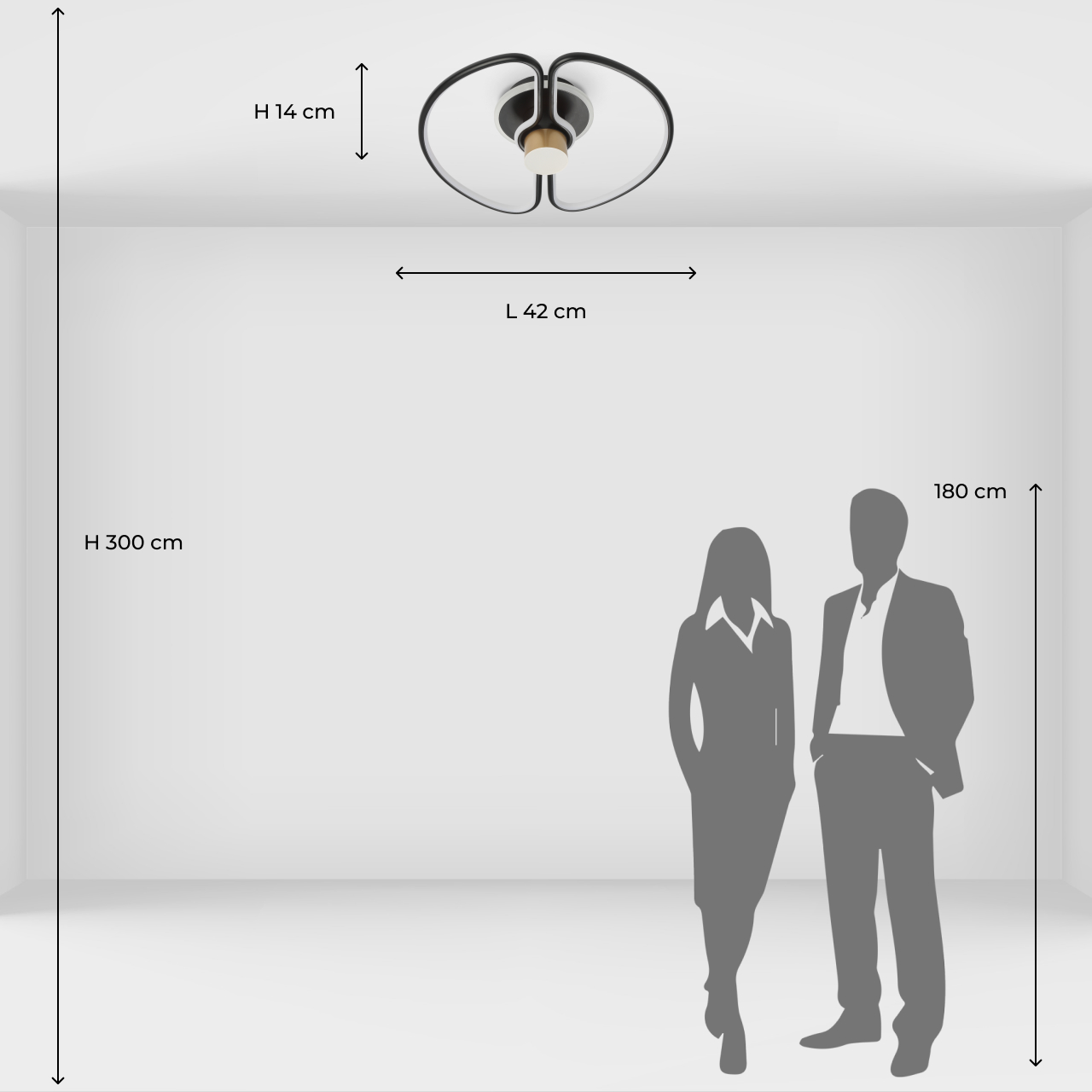 Металлическое основание потолочного светильника и плафон из сплава алюминия окрашены в черный цвет. Металлический элемент в центре гальванизирован в цвет золота. Светодиодный источник света закрыт белым матовым силиконом.