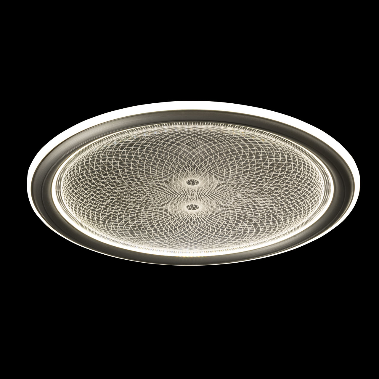 Металлическое основание светильника окрашено в белый цвет. Плафон выполнен из сплава алюминия с цинком и окрашен в цвет серебра. Светодиодные источники света закрыты белым матовым акрилом. Потолочная люстра декорирована металлической пластиной, гальванизированной в цвет хрома и прозрачным акрилом с 3D-эффектом.