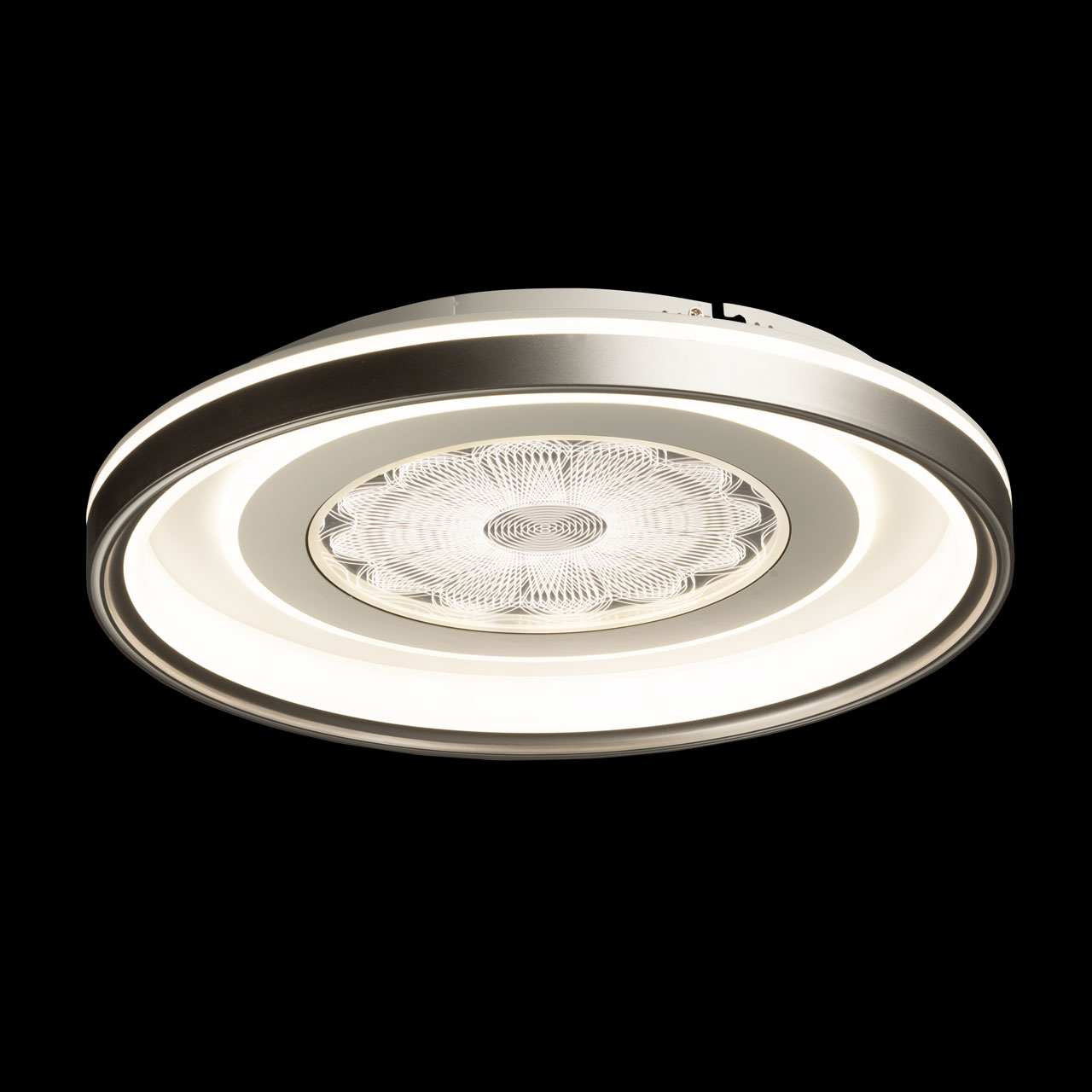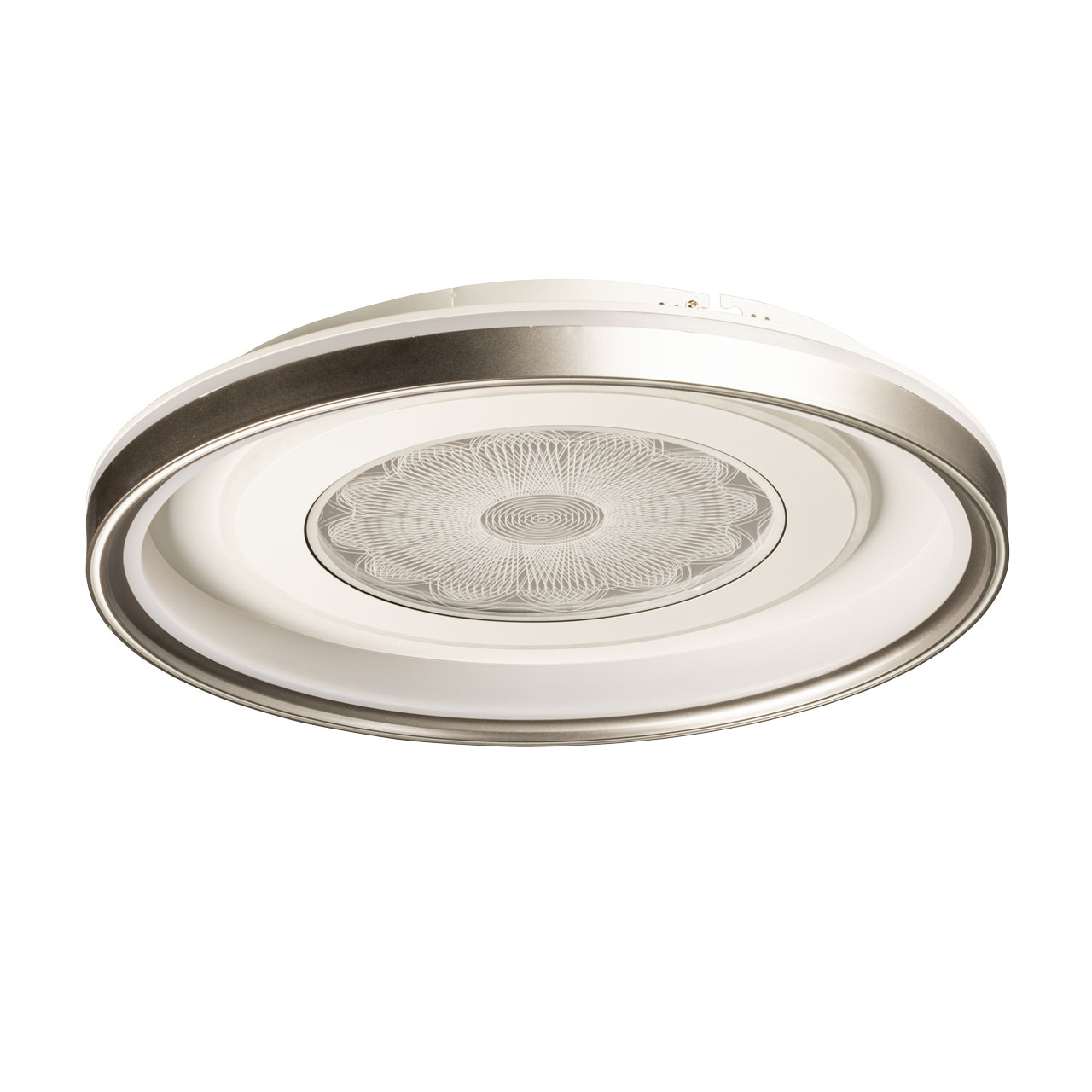 Металлическое основание потолочной люстры окрашено в белый цвет. Корпус плафона выполнен из сплава алюминия с цинком и окрашен в серебряный и белыйцвет. Светодиодные источники света закрыты прозрачным акрилом с 3D-эффектом. Светодиоды по периметру плафона закрыты матовым акрилом