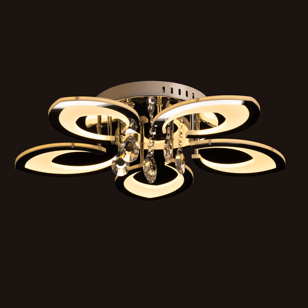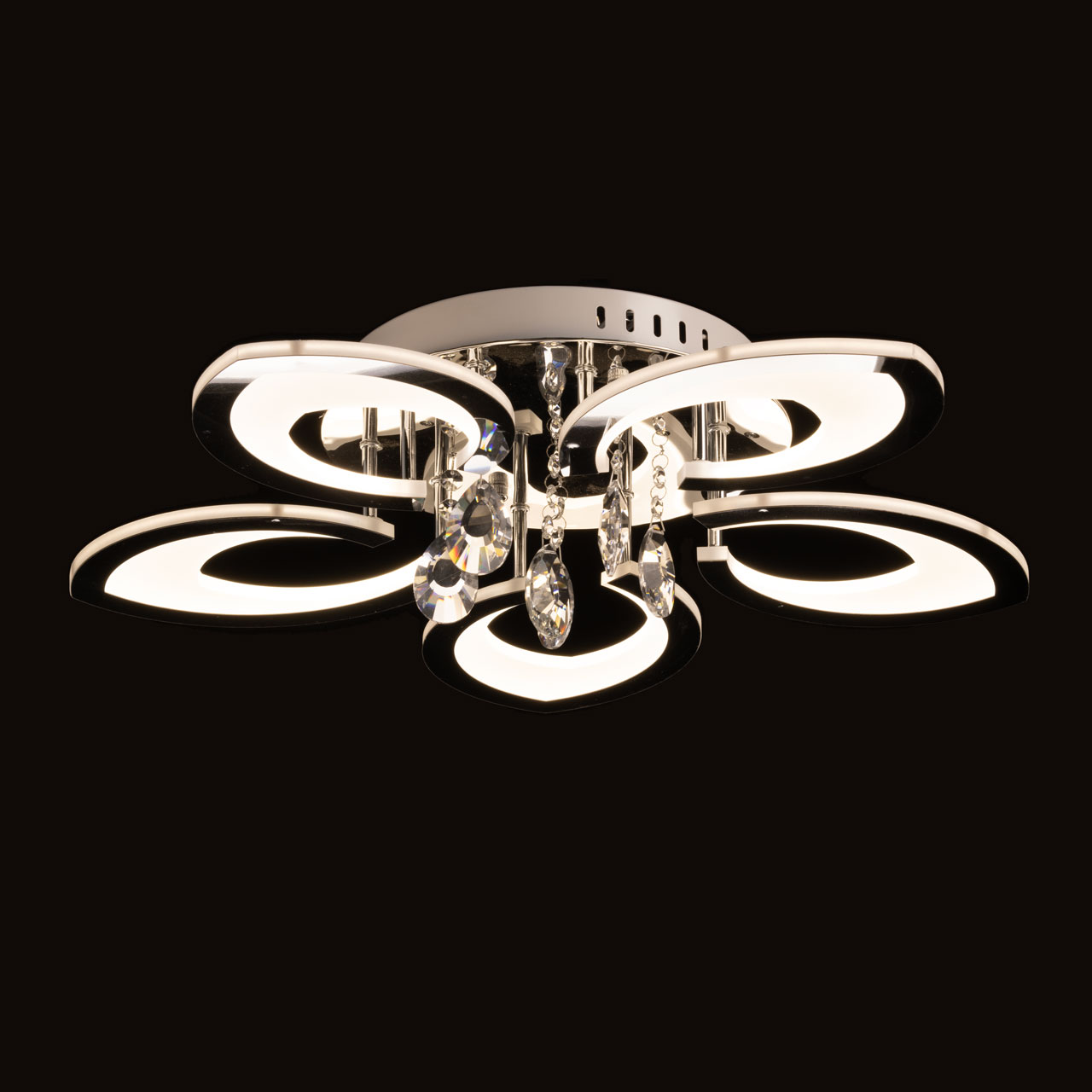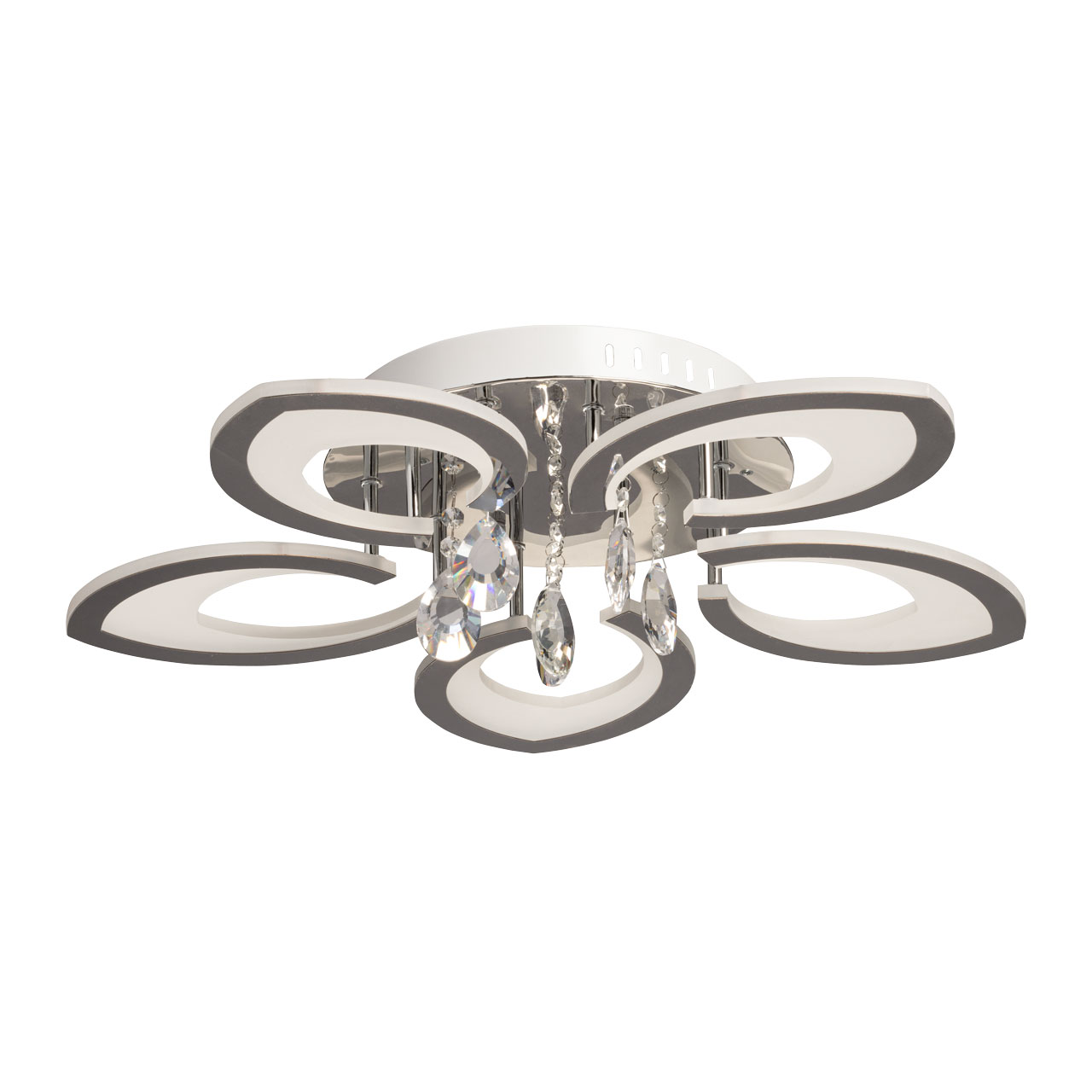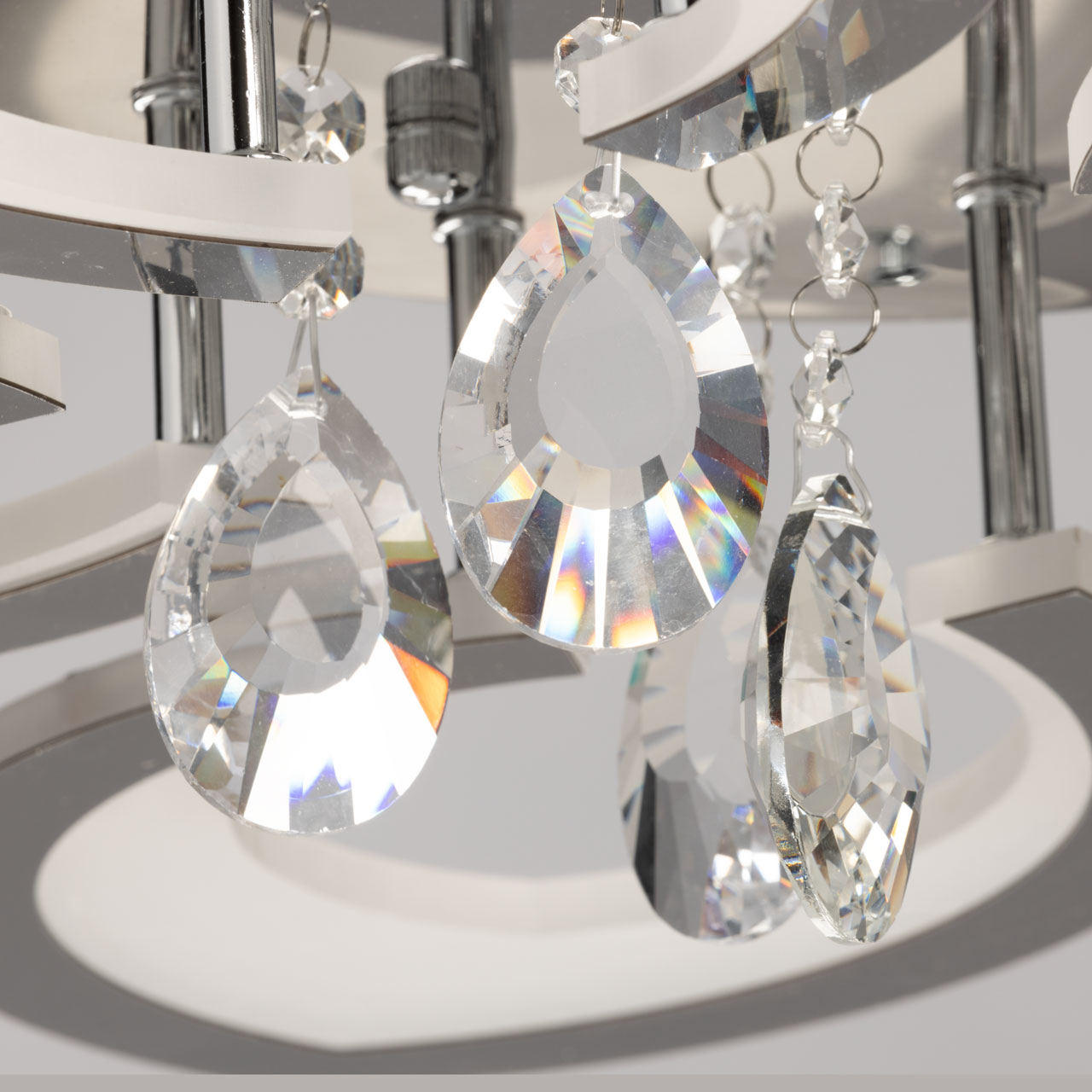 Металлическое основание потолочной люстры гальванизировано в цвет хрома. Светодиодные источники света закрыты белым акрилом. Люстра декорирована пластинами, гальванизированными в цвет хрома и подвесками из прозрачного хрусталя