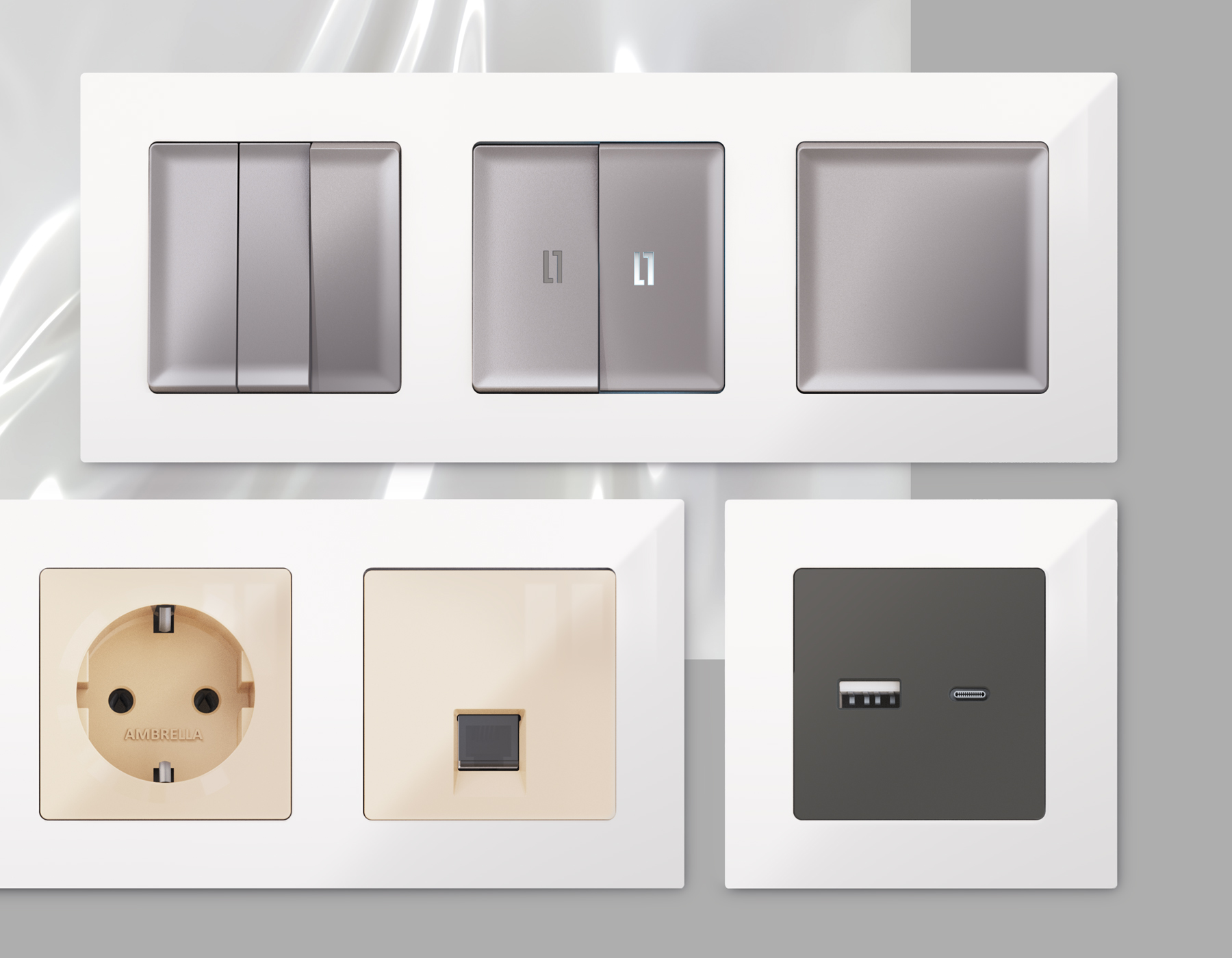Многогранный ассортимент Ambrella Volt включает в себя механизмы, лицевые панели и рамки, а также комплекты, доступные в различных цветовых решениях. Продукция представлена в модульном исполнении, что позволяет гибко настраивать внешнийвид и функциональность. Вам будет легко заменить лицевую панель, рамку или механизм, найдя идеальное сочетание цветов.