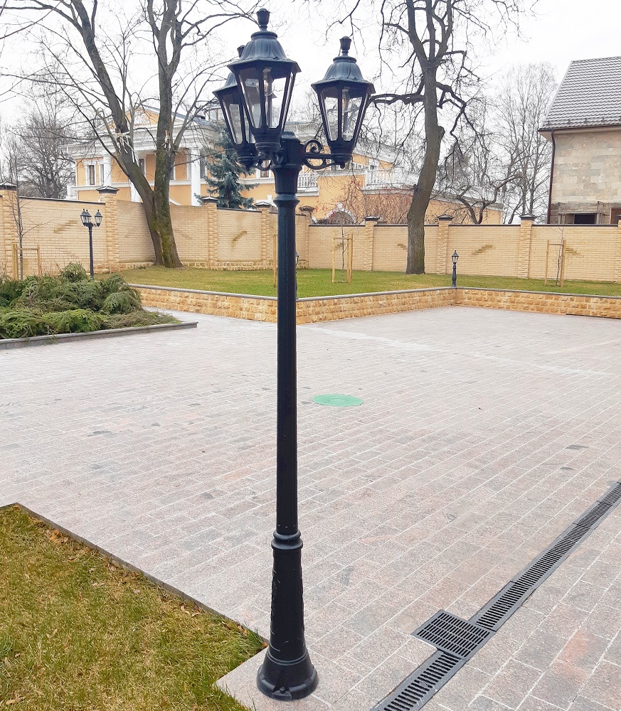 Садово-парковый фонарь FUMAGALLI серии RUT, модель RUT/RICU/BISSO 3L. Парковый торшер, столб RICU с тремя уличными фонарями RUT на малых консолях BISSO установлеными "вверх". Используются для архитектурного и ландшафтного освещения в стиле "классика". Место установки столбиков освещения - парковые дорожки, cкверы, садовые участки, тротуары, а так же ландшафтные и архитектурные объекты. Изготовлены в Италии, по уникальным технологиям "FUMAGALLI" из современного композитного полимера RESIN. Этот материал в 5 раз прочнее металла, не ржавеет, не окисляется, не выгорает на солнце, его не нужно красить. Все светильники пыле-влаго защищены по стандарту IP55 (Пылезащищенные, защита от водяных струй с любого направления). Рассеиватель выполнен из антивандального, не мутнеющего и не горючего PMMA (ПолиМетилМетаАкрилат). Срок службы светильника - не менее 20 лет. Температура использования от -60 до +90. В серии RUT есть фонари в настенном (BISSO/ RUT, OFIR/ RUT, MIRRA/ RUT, PORPORA/ RUT) подвесном (SICHEM/ RUT) и наземном исполнении (MINILOT/ RUT, MIZAR.R/ RUT, IAFAET.R/ RUT, ALOE.R/ RUT, ARTU/ RUT, GIGI/ RUT, RICU/ RUT, RICU/ISSO/ RUT 2L, NEBO/ RUT, NEBO OFIR/ RUT 2L, NEBO OFIR/ RUT 3L) со столбами разной высоты, с разным количеством и конфигурацией голов. Консоли настенных фонарей и кронштейны светильников на столбах освщения могут устанавливаться вверх/вниз. Столбы выше 150 см имеют в основе мощную стальную трубу с двойной оцинковкой. При заказе требуется выбрать цвет корпуса, цвет плафона и тип патрона. По стилю и дизайну серия уличных светильников RUT похожа на светильники малого размера серии ANNA и на светильники большого размера серии NOEMI. По размеру RUT относится к средним светильникам как серия CEFA, SALEM и GLOBE 300.