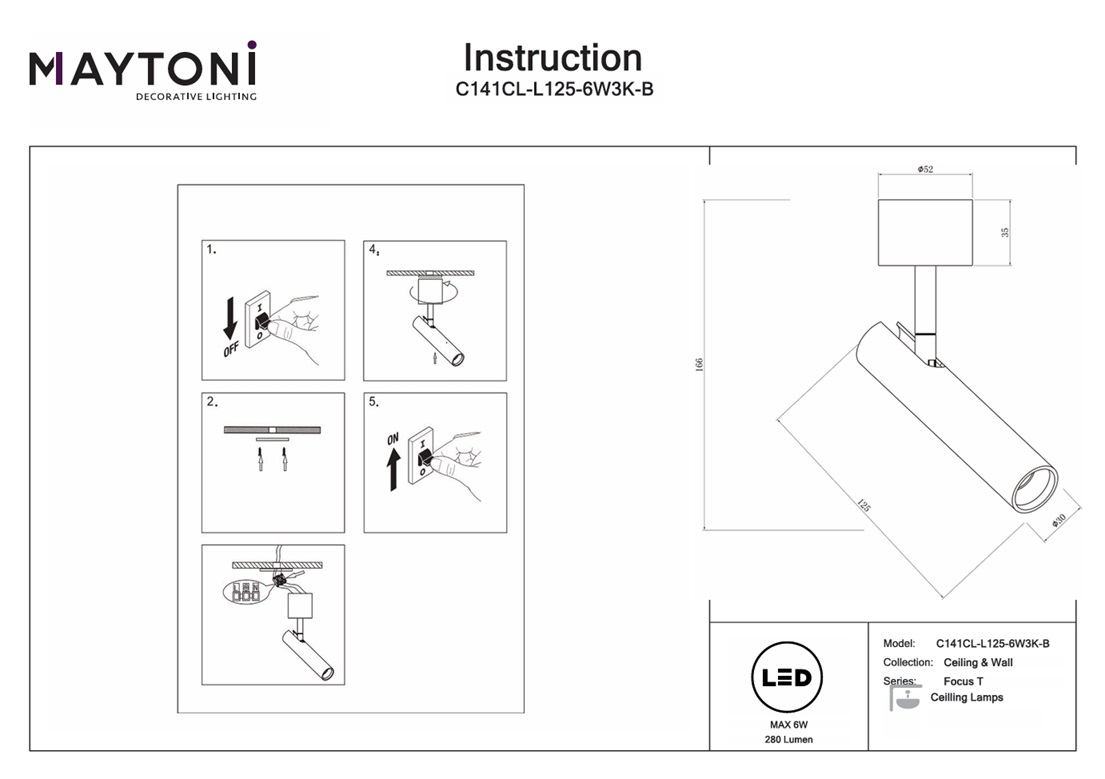 Спот поворотный Maytoni Focus T C141CL-L125-6W3K-B — это надёжный и долговечный осветительный прибор, который прослужит вам долгие годы, не теряя своей яркости и качества света.