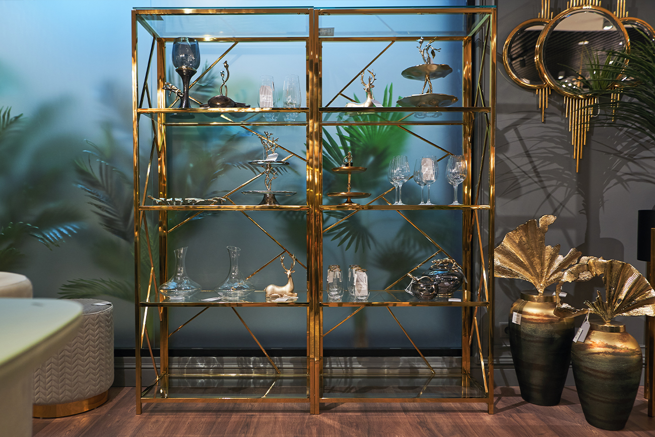 Хит продаж! Изысканный стеллаж из полированной нержавеющей стали золотого цвета с полками из прозрачного закаленного стекла. Нагрузка на полку до 10кг , поэтому вы можете хранить в стеллаже не только наградные кубки, посуду или статуэтки, но и даже книги...