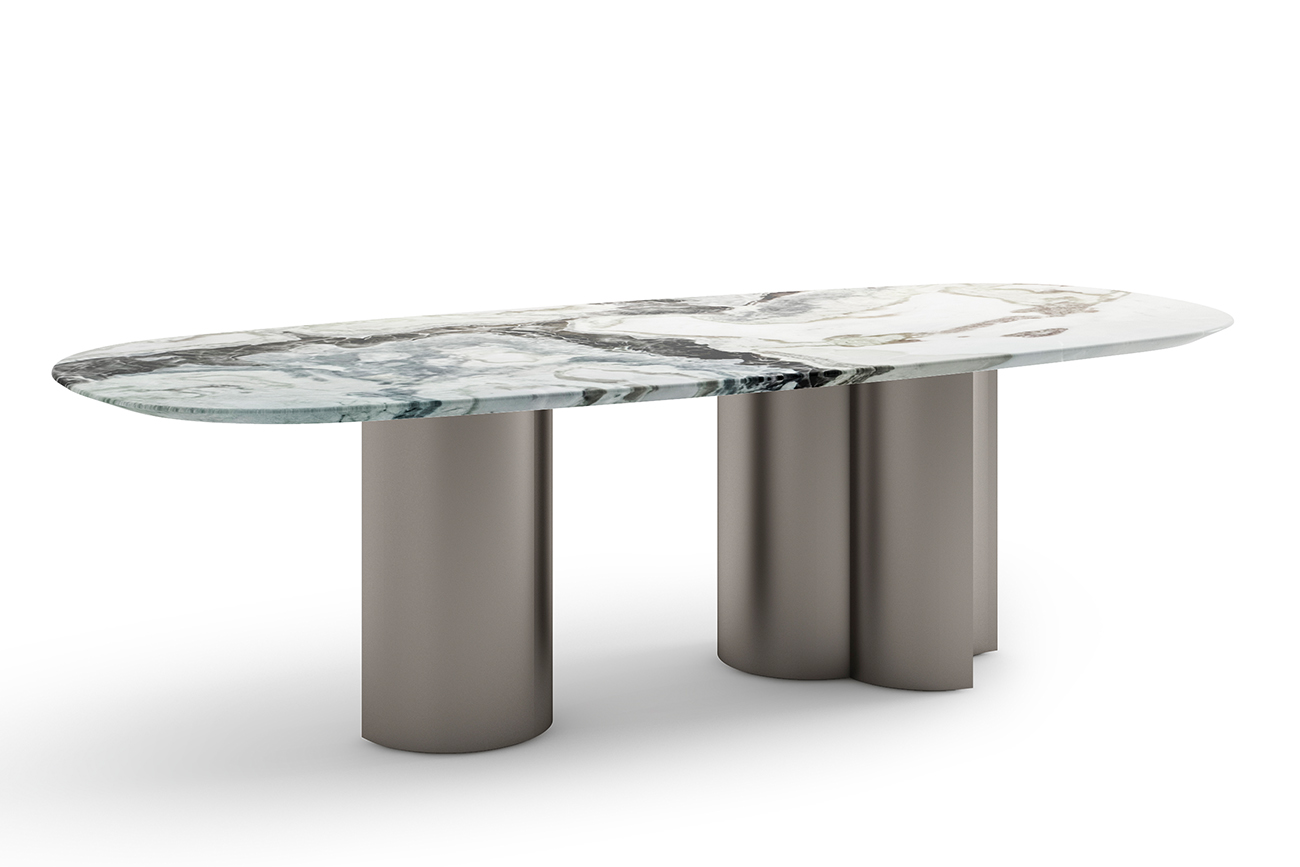 Обеденный стол с мраморной столешницей выглядит фундаментально и массивно за счет основания в виде колонн из нержавеющей стали. Такое стилистическое решение добавляет мебели не только устойчивости и надежности в эксплуатации, но и подчеркивает ее индивиду...