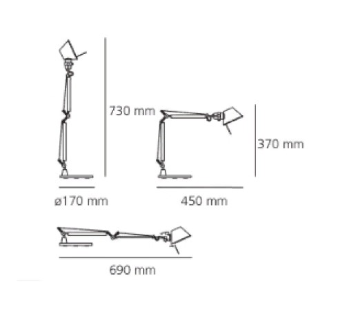 Корпус настольной лампы Tolomeo Micro. Основание и суставы корпуса из полированного алюминия, рассеиватель из анодированного матового алюминия; цвет — желтый металлик. Система пружинной балансировки. Регулируемые размеры в зависимости от положения. Настольное основание отсутствует.