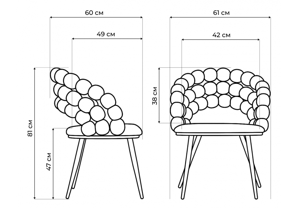 Материал каркаса - металл; Материал сиденья - велюр; Материал обивки - велюр; Ширина - 61; Глубина - 60; Высота - 81; Ширина сиденья - 42; Глубина сиденья - 49; Высота сиденья - 47;
