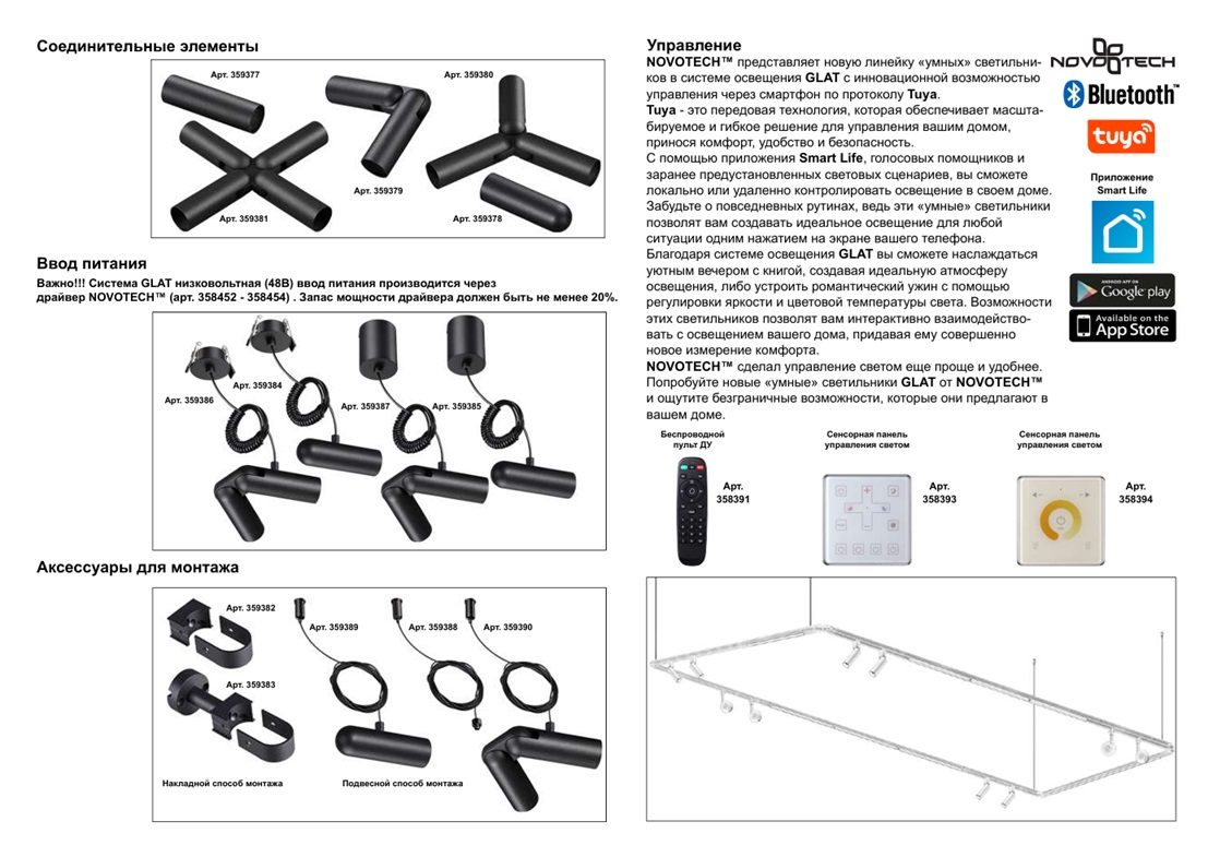 Светильник диммируемый светодиодный с пультом ДУ Novotech GLAT 359366 — это модель, которая является частью модульной системы GLAT, представляющей собой комплект из низковольтных светодиодных «умных» светильников (арт. 359362 - 359376), соединительных элементов (арт. 359377 - 359383) и различных баз для ввода питания (арт. 359384 - 359387). Благодаря источнику света с типом цоколя LED и мощностью 8 Вт, а также с цветовой температурой 3000 К-6000 К, этот осветительный прибор обеспечивает комфортное и равномерное освещение на площади в 3,2 квадратных метра, создавая уютную атмосферу в вашем доме. Световой поток равен 640 Лм. Алюминиевый корпус в черном цвете и прозрачный пластиковый плафон в форме небольших круглых линз придают светильнику современный и стильный вид. Размеры устройства составляют 28 мм х 395 мм, что позволяет легко интегрировать его в любое интерьерное пространство. Технической особенностью является высокая цветопередача >90 CRI. Модели, входящие в коллекцию GLAT, идеально подойдут для размещения в зоне гостиной, спальни, кабинета или офиса, оформленных в стиле Техно или Хай-тек. Особенностью системы GLAT является использование безопасного питания постоянным током с напряжением 48В. Для обеспечения оптимальной работы системы рекомендуется использование выносных драйверов NOVOTECН. В наличии имеются три модели драйверов с различной мощностью: арт. 358452–100Вт, арт. 358453–150Вт и арт. 358454–200Вт. Расчет мощности драйвера осуществляется на основе суммарной мощности всех светильников в системе, увеличенной на 20%. Такой подход позволяет обеспечить достаточный запас мощности и защитить систему от перегрузок. Относительно способа монтажа, модульная система GLAT предлагает два варианта: накладной и подвесной монтаж. Выбор способа зависит от конкретных условий помещения и предпочтений пользователя, тем самым у вас есть возможность создать свой собственный сценарий освещения пространства. Управление светильниками происходит с помощью пульта ДУ, а также с инновационной возможностью управления через смартфон по протоколу Tuya или с Яндекс Алисой. Tuya - это передовая технология, которая обеспечивает масштабируемое и гибкое решение для управления вашим домом, принося комфорт, удобство и безопасность. С помощью приложения Smart Life, голосовых помощников и заранее предустановленных световых сценариев, вы сможете локально или удаленно контролировать освещение в своем доме. Забудьте о повседневных рутинах, ведь эти «умные» светильники позволят вам создавать идеальное освещение для любой ситуации одним нажатием на экране вашего телефона. Светильник диммируемый светодиодный с пультом ДУ Novotech GLAT 359366 — это надёжный и долговечный осветительный прибор от венгерского производителя, который позволит вам интерактивно взаимодействовать с освещением вашего дома, придавая ему совершенно новое измерение комфорта. Данную спешите 359366 купить с быстрой доставкой в магазине 220svet.ru