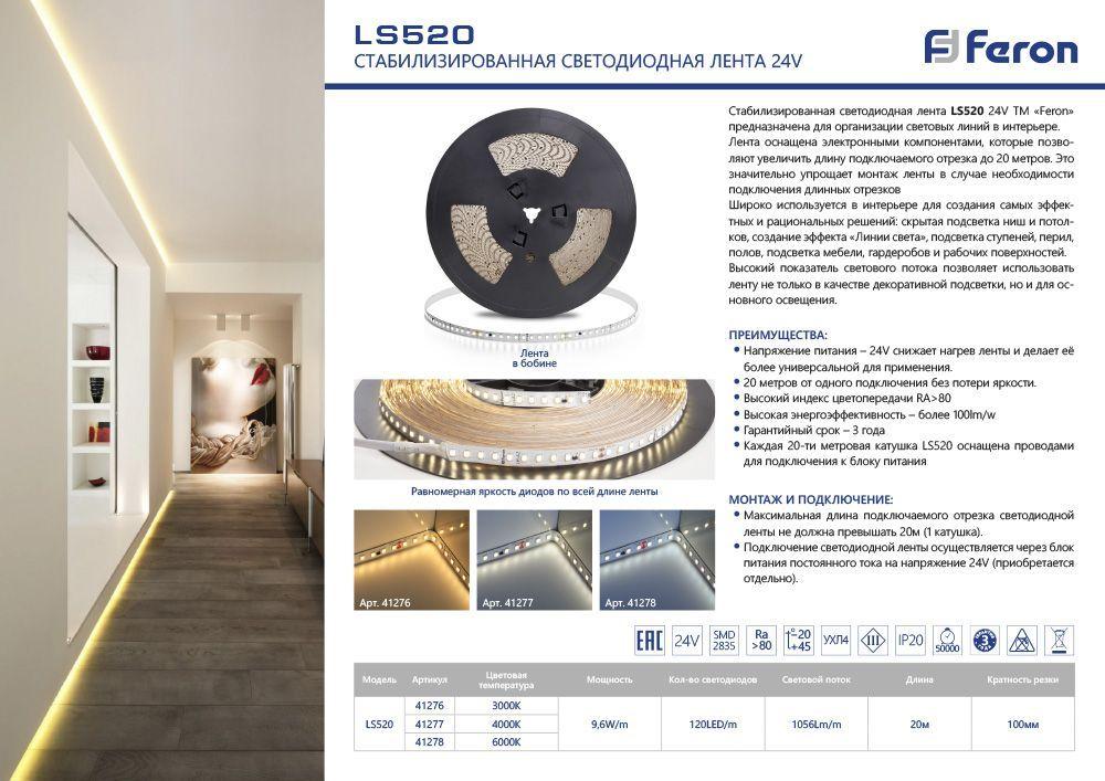 Светодиодная лента Feron 9, 6W/m 120LED/m 2835SMD белый 20M LS520 41277 в Краснодаре