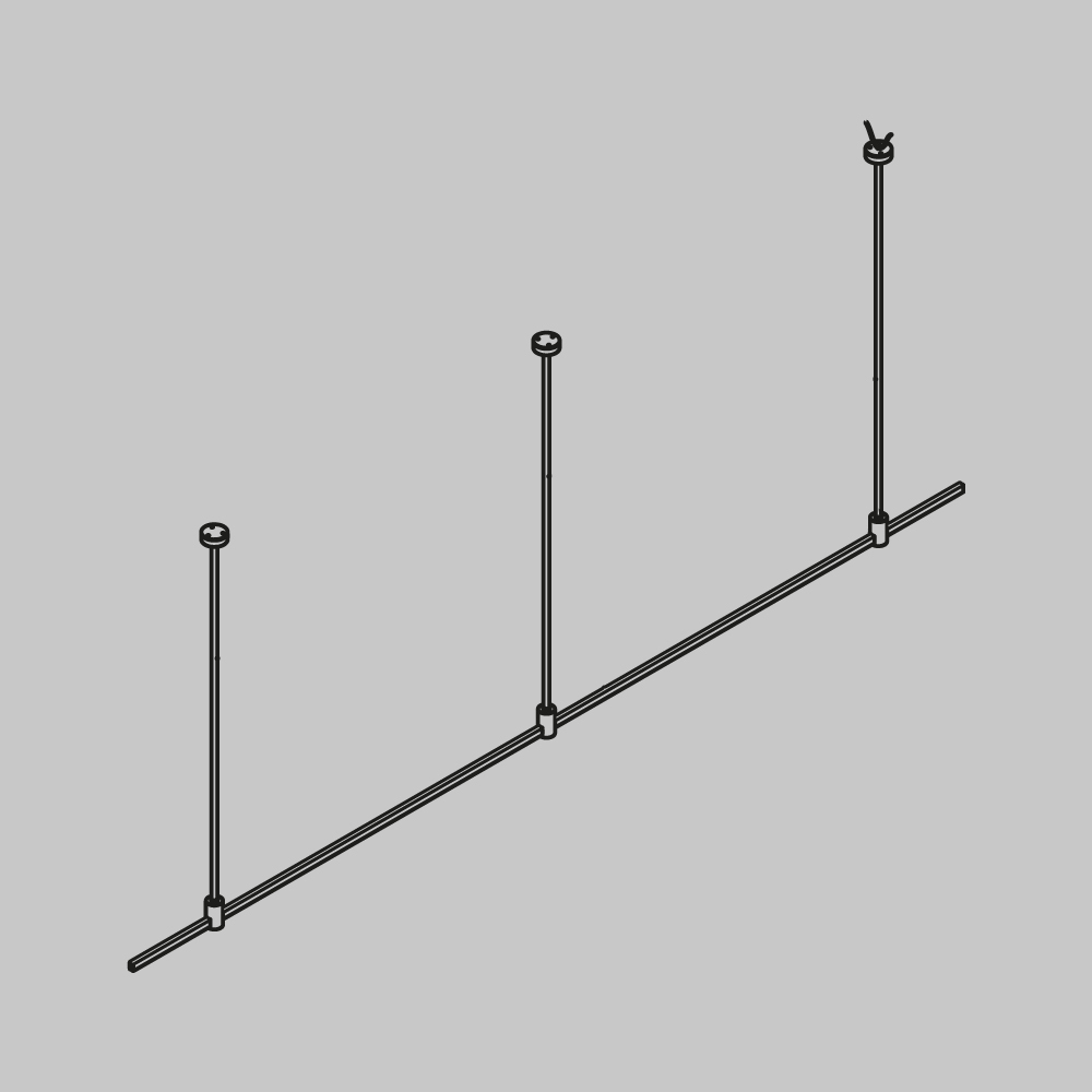 Подвесная конструкция системыFlarityпрямойформыстросовыми подвесами . Светильники и блоки питания приобретаются отдельно, в зависимости от требуемого проекта.