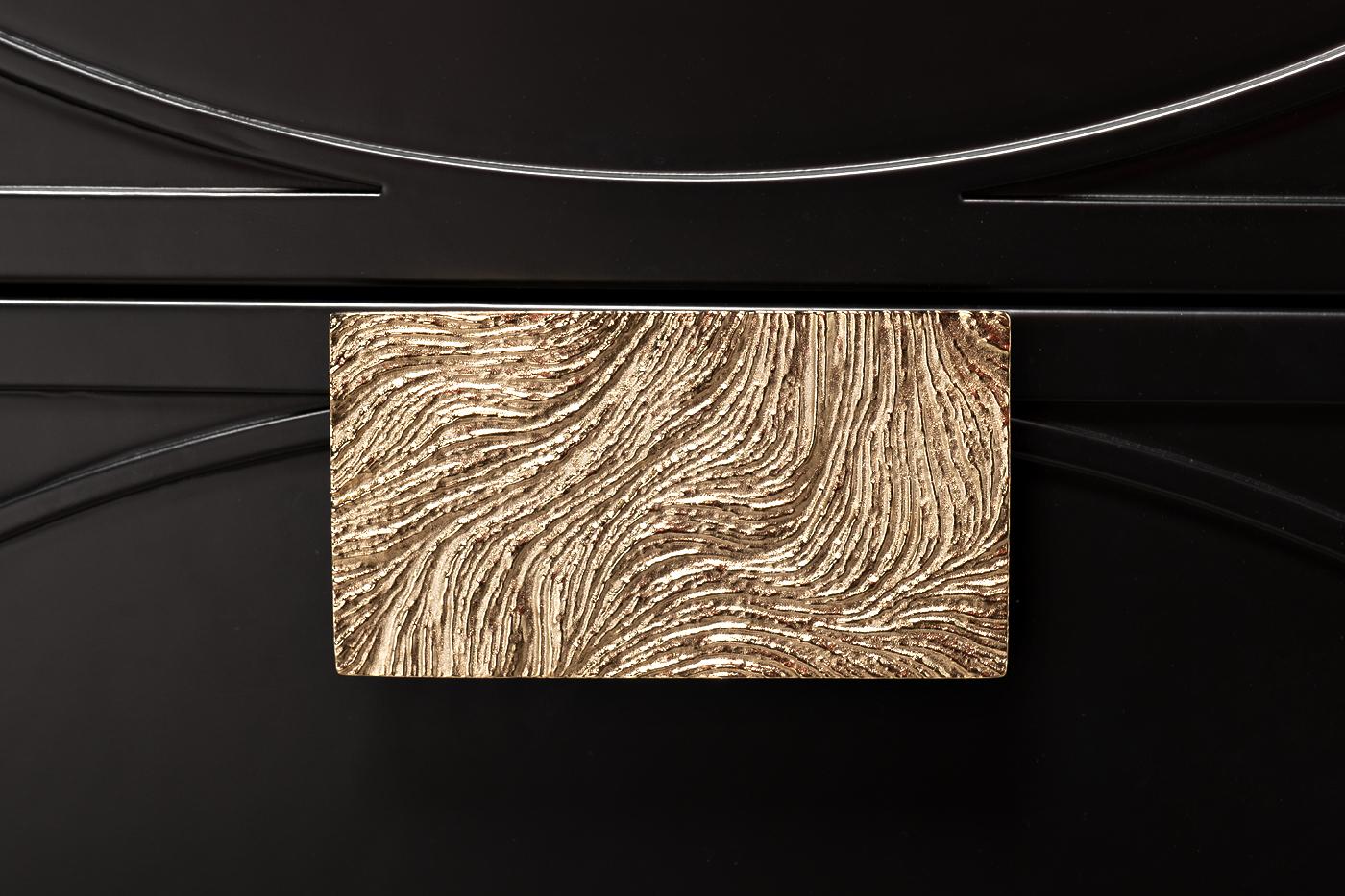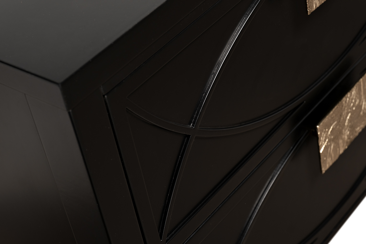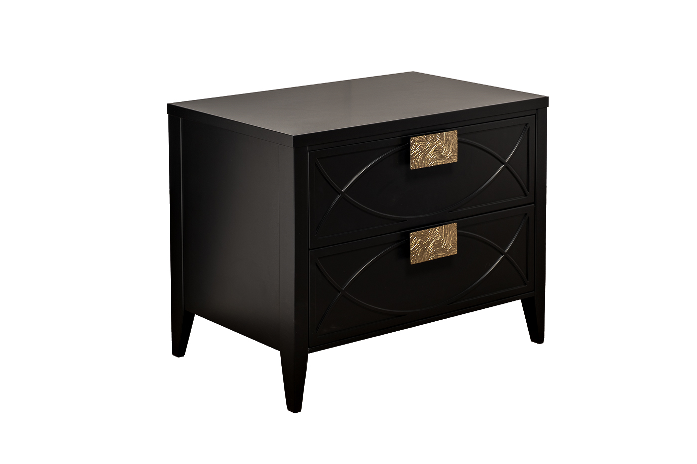 Дизайнерская тумбочка в стиле ар-деко - авторская разработка студии Garda Decor. Черный матовый фасад украшен объемным дугообразным декором и широкими рельефными ручками золотого цвета (глянцевое золото). Два выдвижных ящика прекрасно подойдут для домашней аптечки, хранения белья, щеток, косметики и прочих мелочей. На просторной столешнице будет прекрасно выглядеть одна из настольных ламп в стилистике ар-деко, ассортимент которых широко представлен на нашем сайте. Тонкие ножки придают конструкции легкость и изящество. Эксклюзивная тумбочка станет гармоничным дополнением интерьера спальни, гостиной или прихожей.