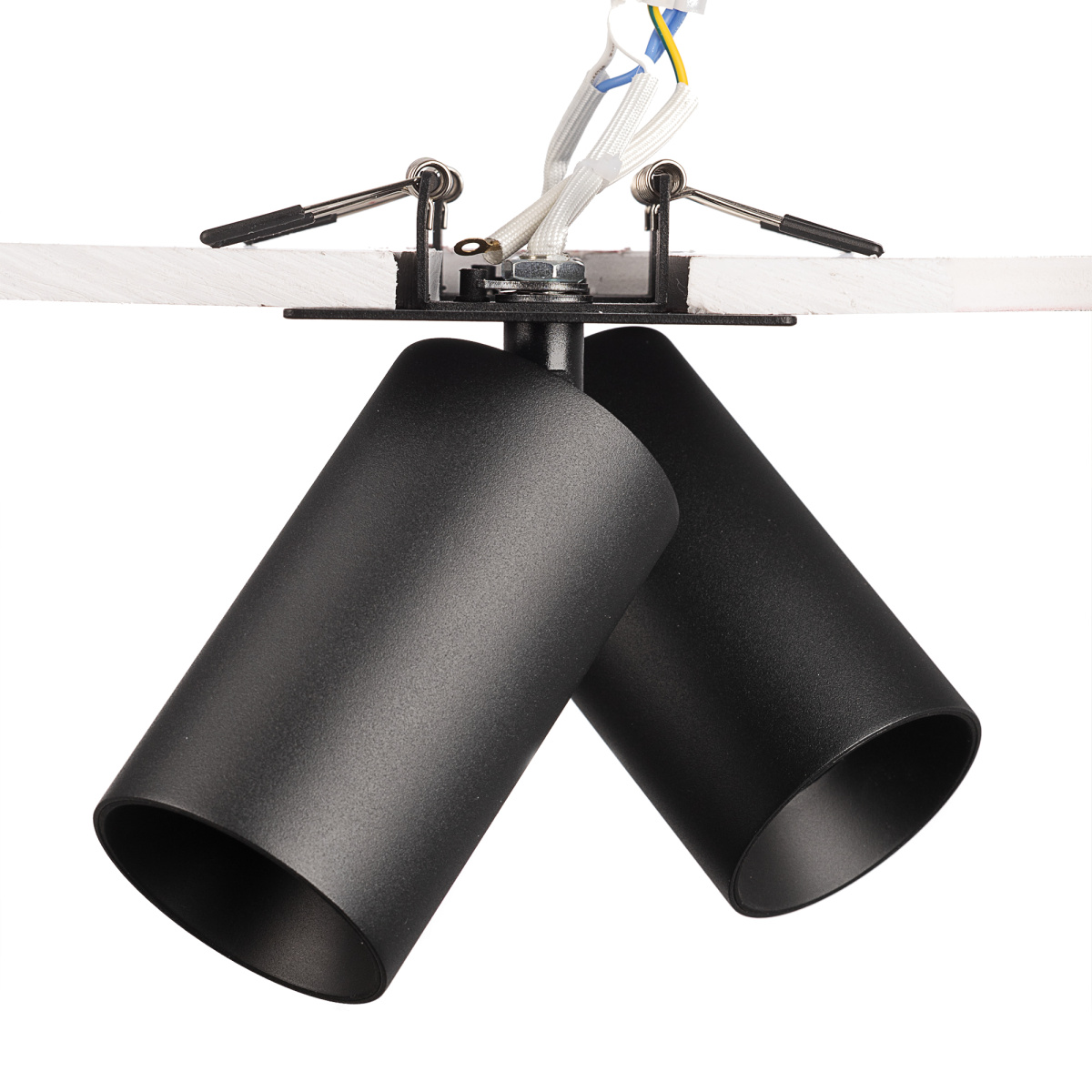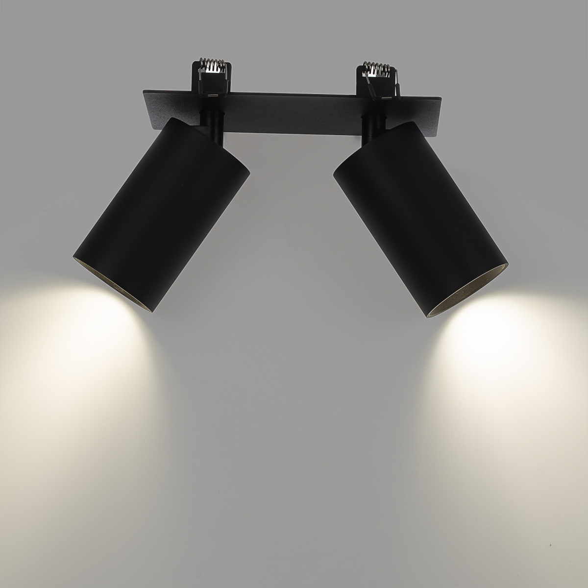 Корпус модели металлический, стильного черного оттенка. Плафоны цилиндрической формы имеют поворотное крепление, позволяющее менять направление светового луча. Источником света служат две светодиодные лампочки с цоколем GU10 мощностью не более 10Вт, встраиваемый тип крепления. Плафоны вращаются независимо друг от друга, что дает возможность формировать разный рисунок света.